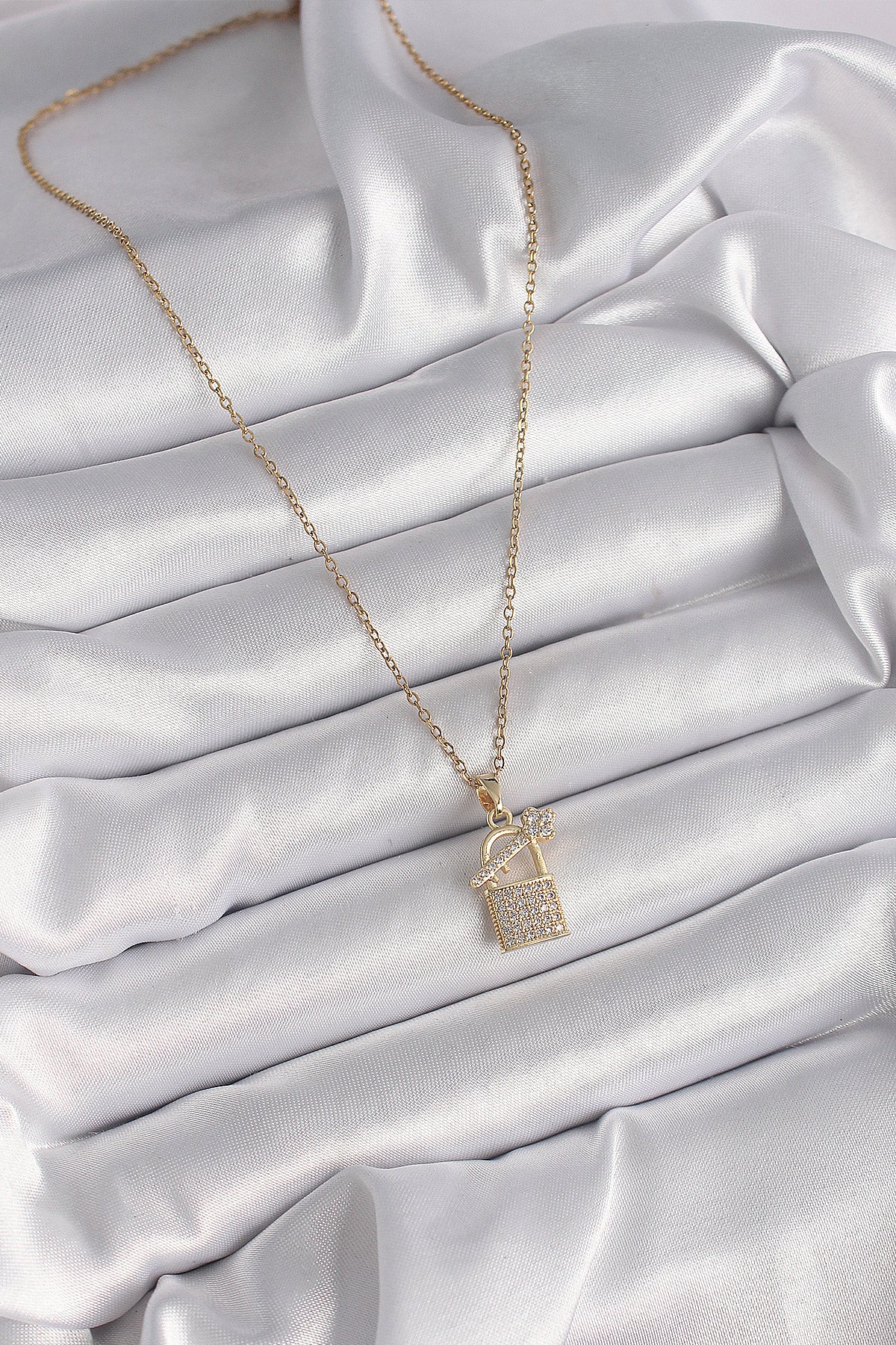 BKO9585 - 316L Çelik Gold Renk Zincir Zirkon Taşlı Asma Kilit Anahtar Model Kadın Kolye