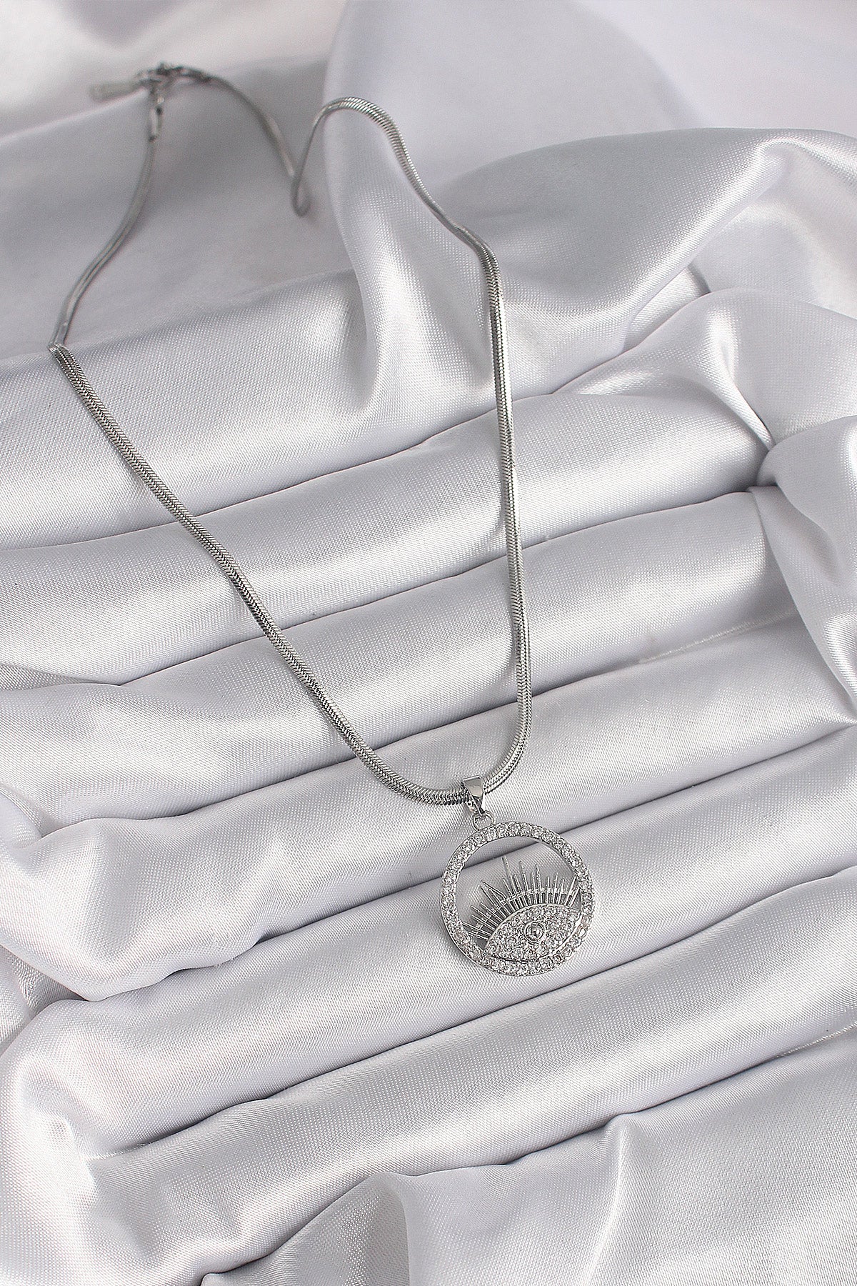 BKO9592 - 316L Çelik Gümüş Renk İtalyan Zincir Zirkon Taşlı Göz Model Kadın Kolye