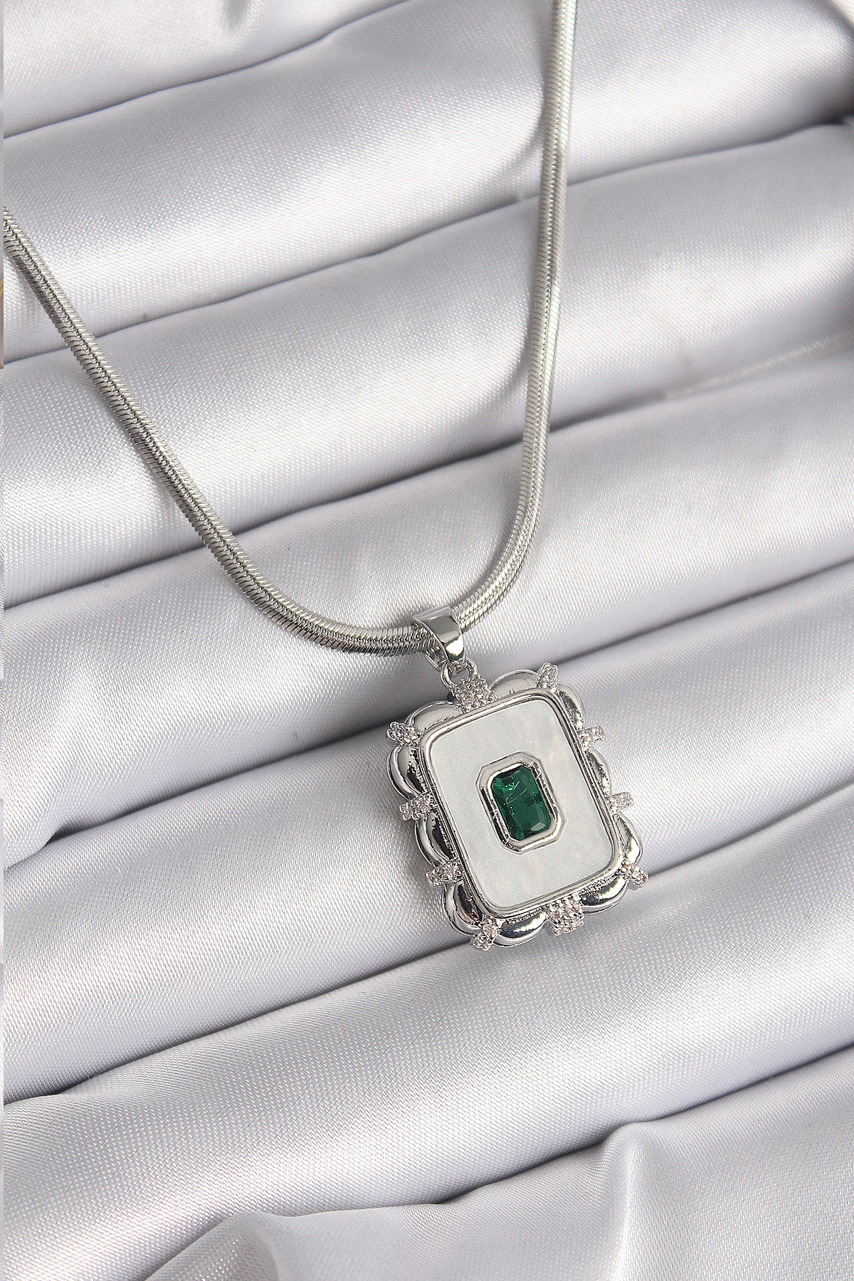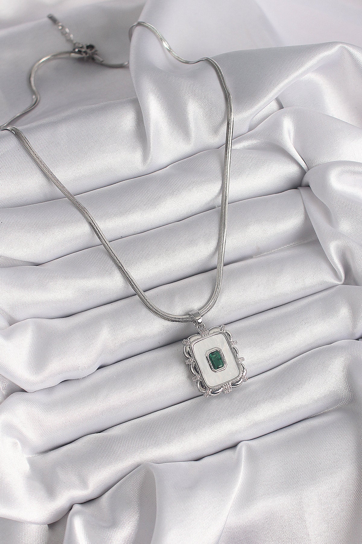 - Ürün Adı: 316L Çelik Gümüş Renk İtalyan Zincir Beyaz Sedefli Kare Portre Model Zümrüt Taş Detay Kadın Kolye