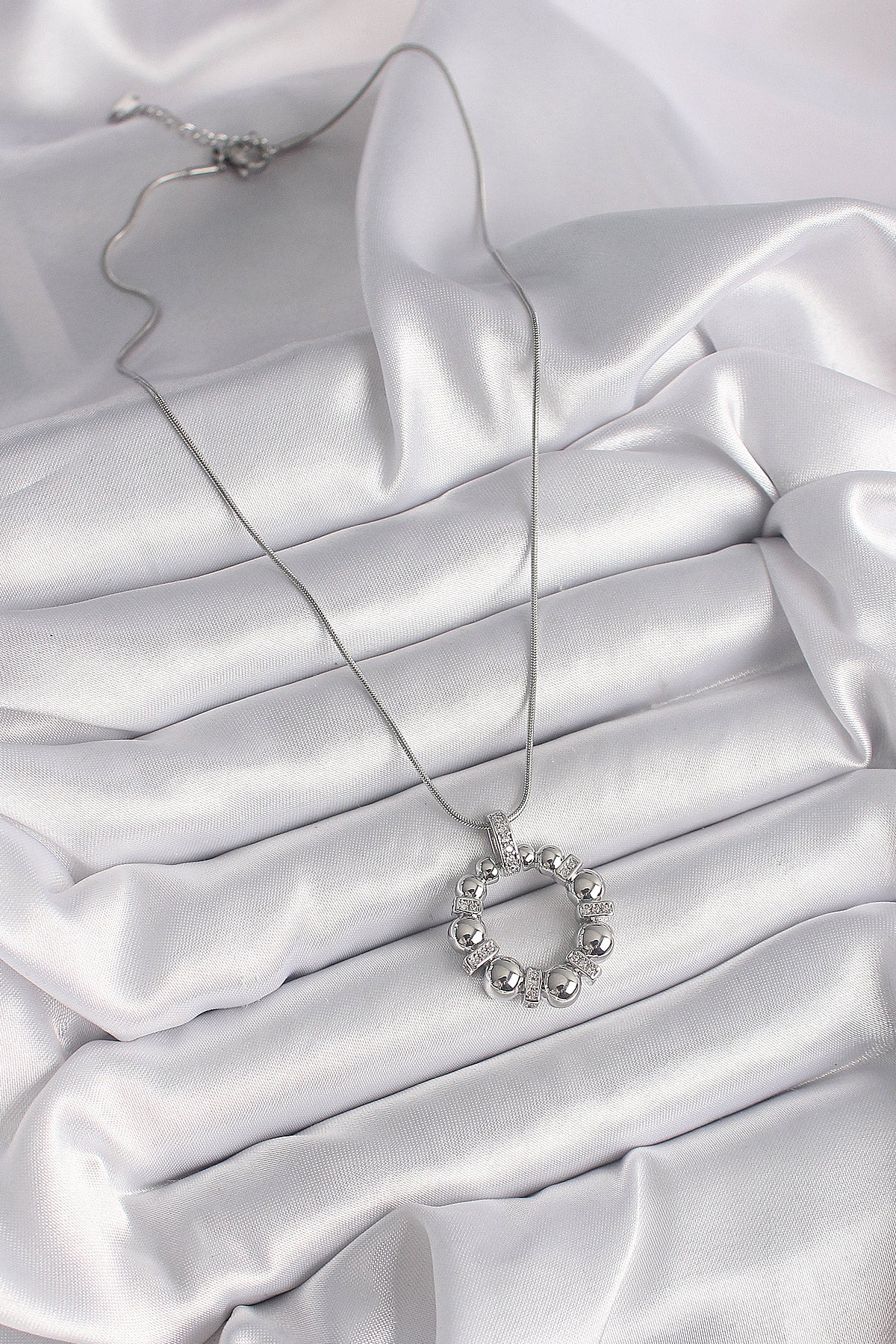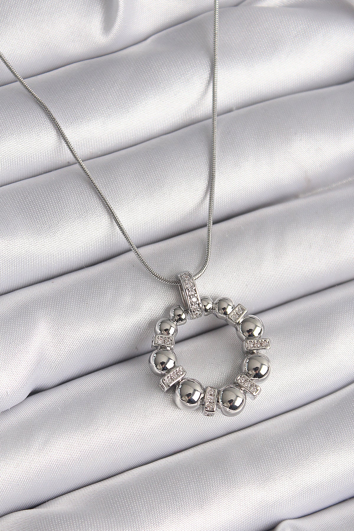 BKO9604 - 316L Çelik Gümüş Renk Zincir Zirkon Taş Detaylı Bombeli Halka Model Kadın Kolye