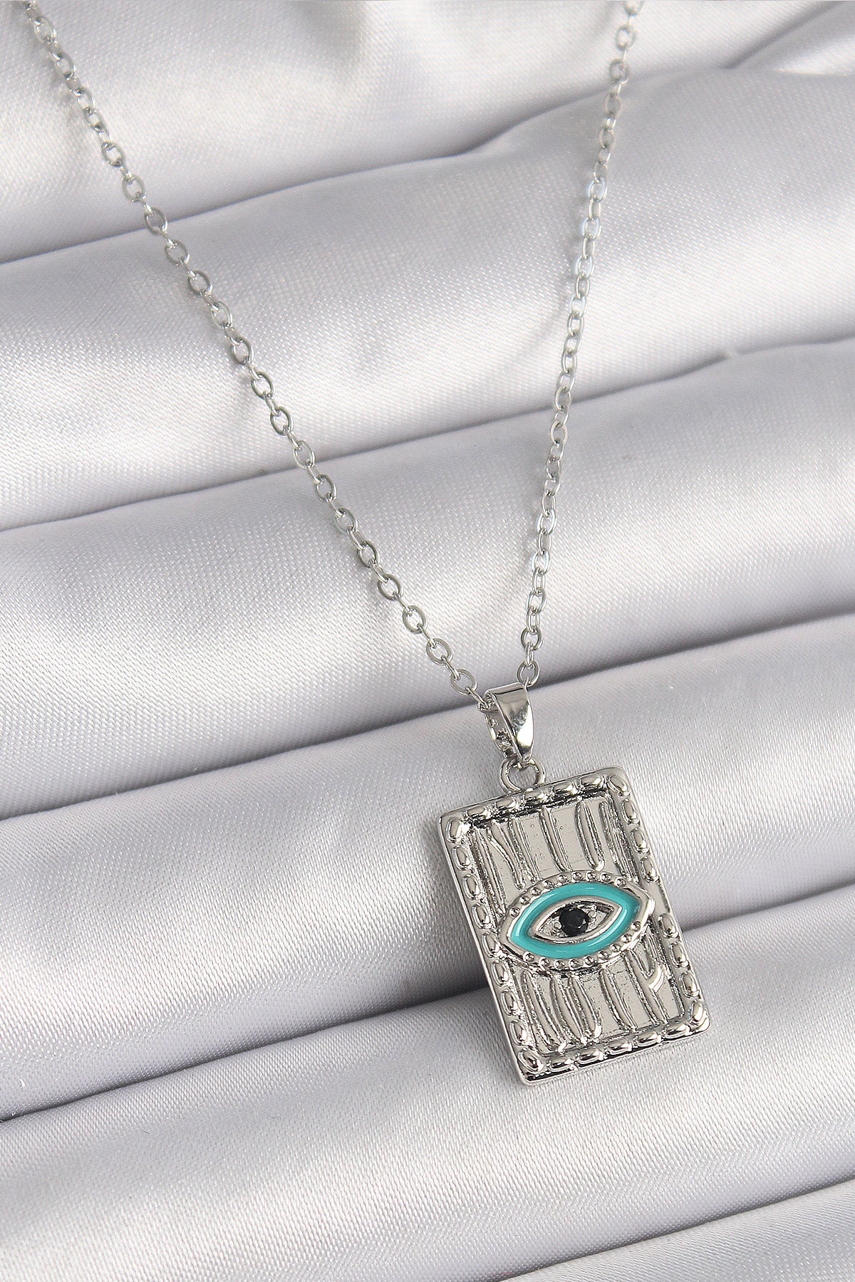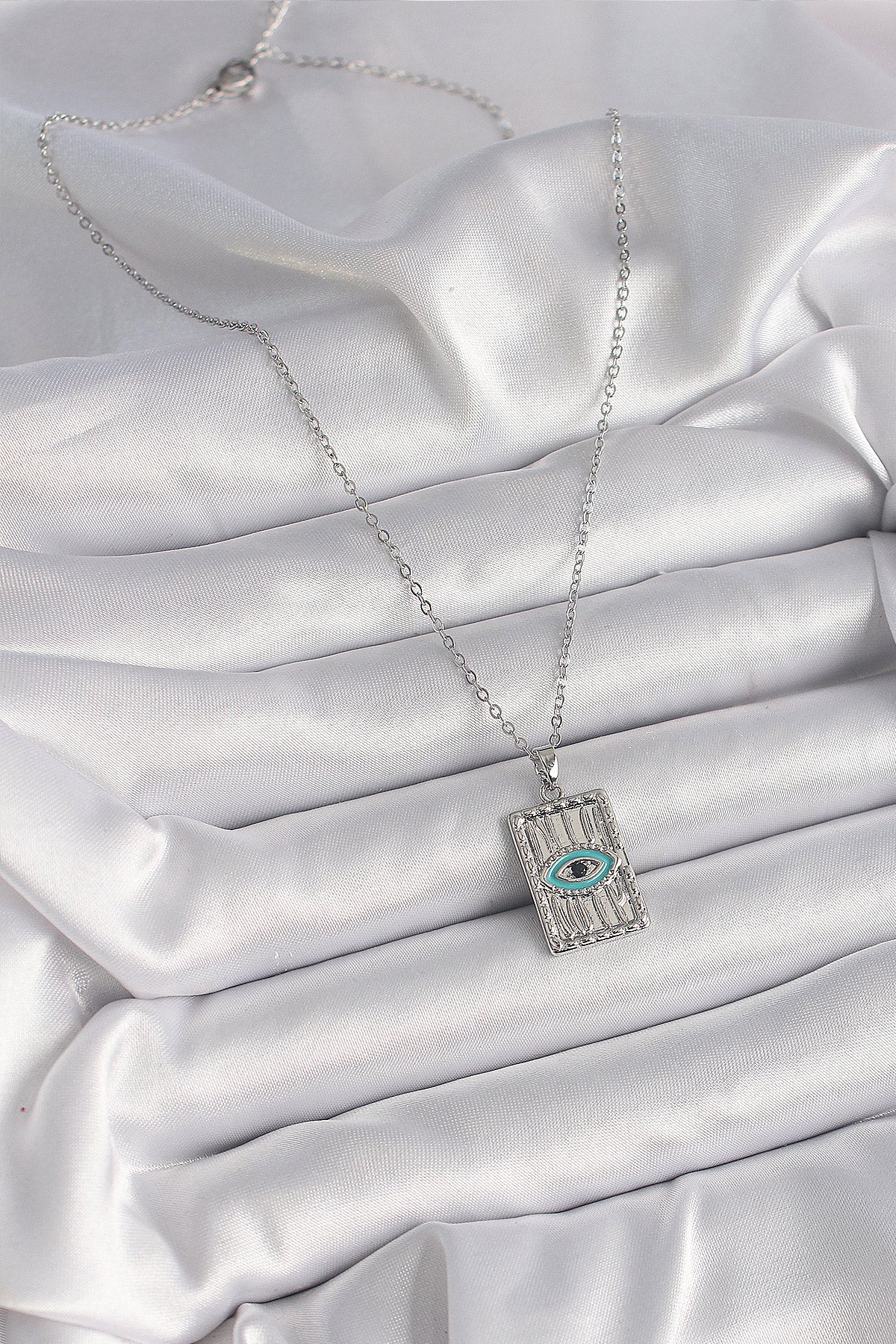 BKO9616 - 316L Çelik Gümüş Renk Zirkon Taşlı Göz İşleme Detaylı Plaka Model Kadın Kolye