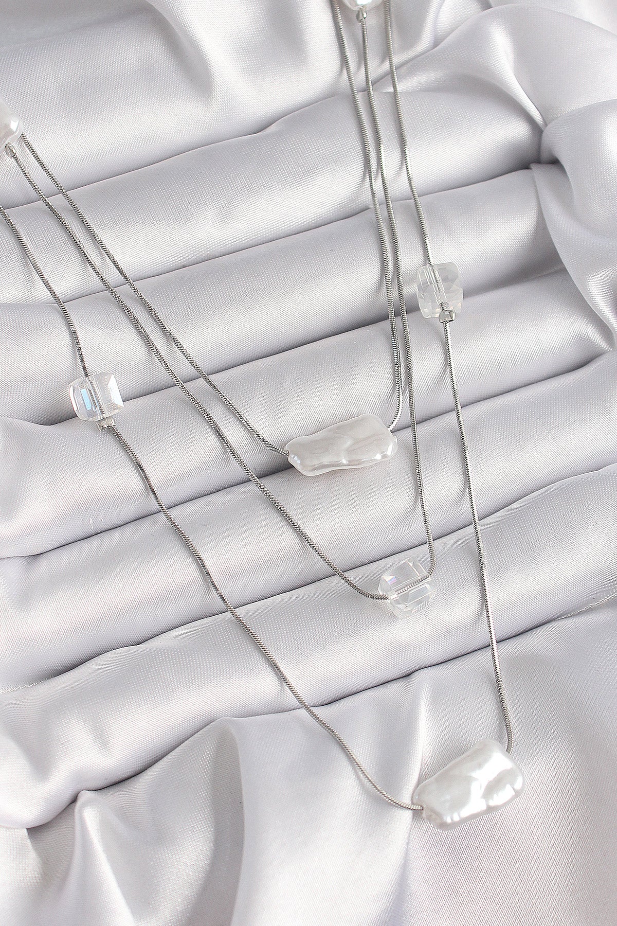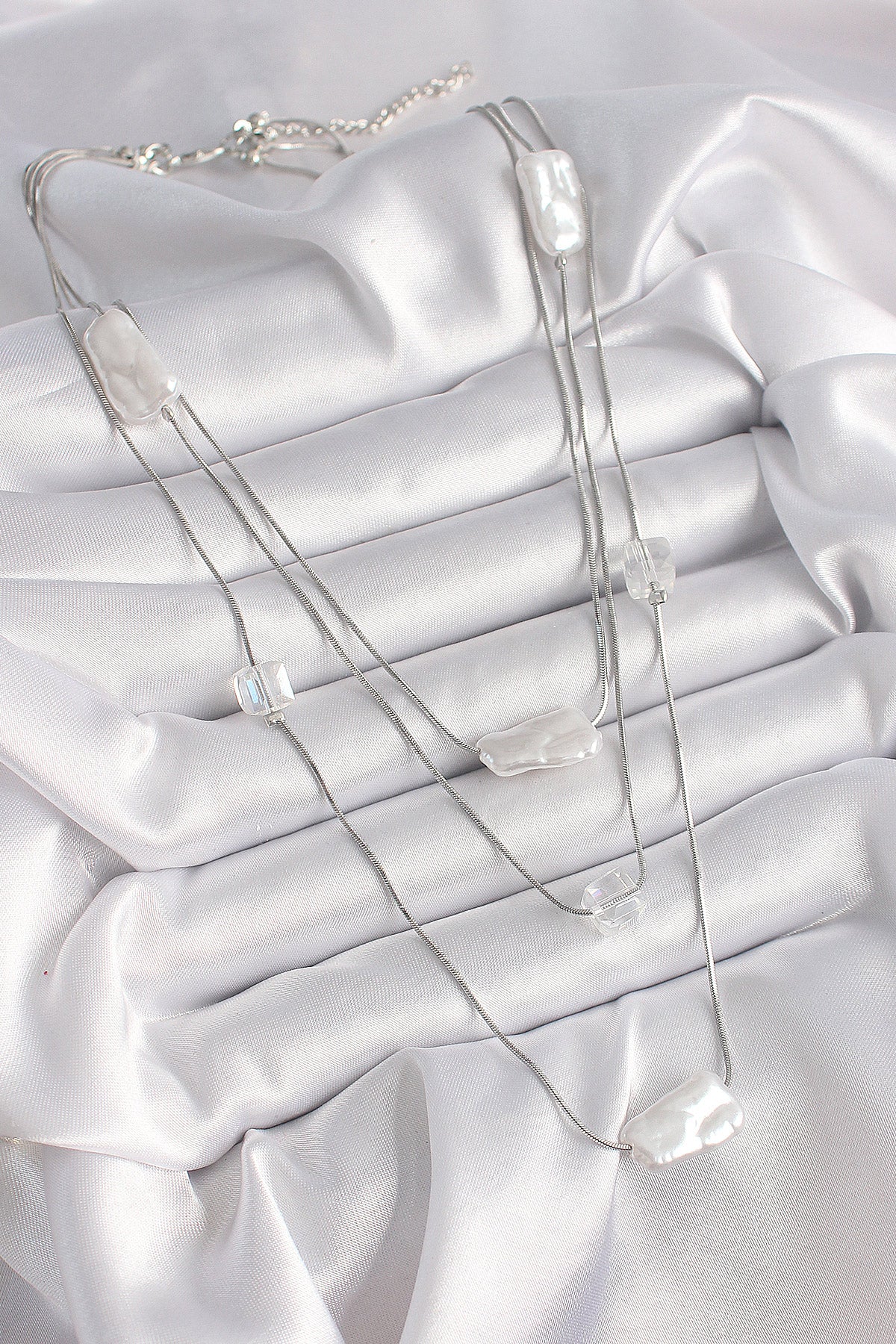 BKO9620 - Pirinç Gümüş Renk Ezme İnci Model Çoklu Kadın Kolye
