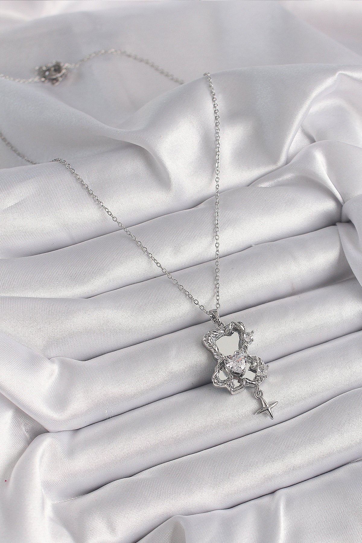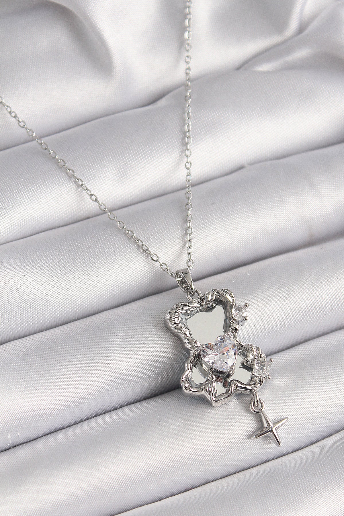 BKO9627 - 316L Çelik Gümüş Renk Ayna Ayıcık Model Zirkon Taşlı Kalp Detay Kadın Kolye