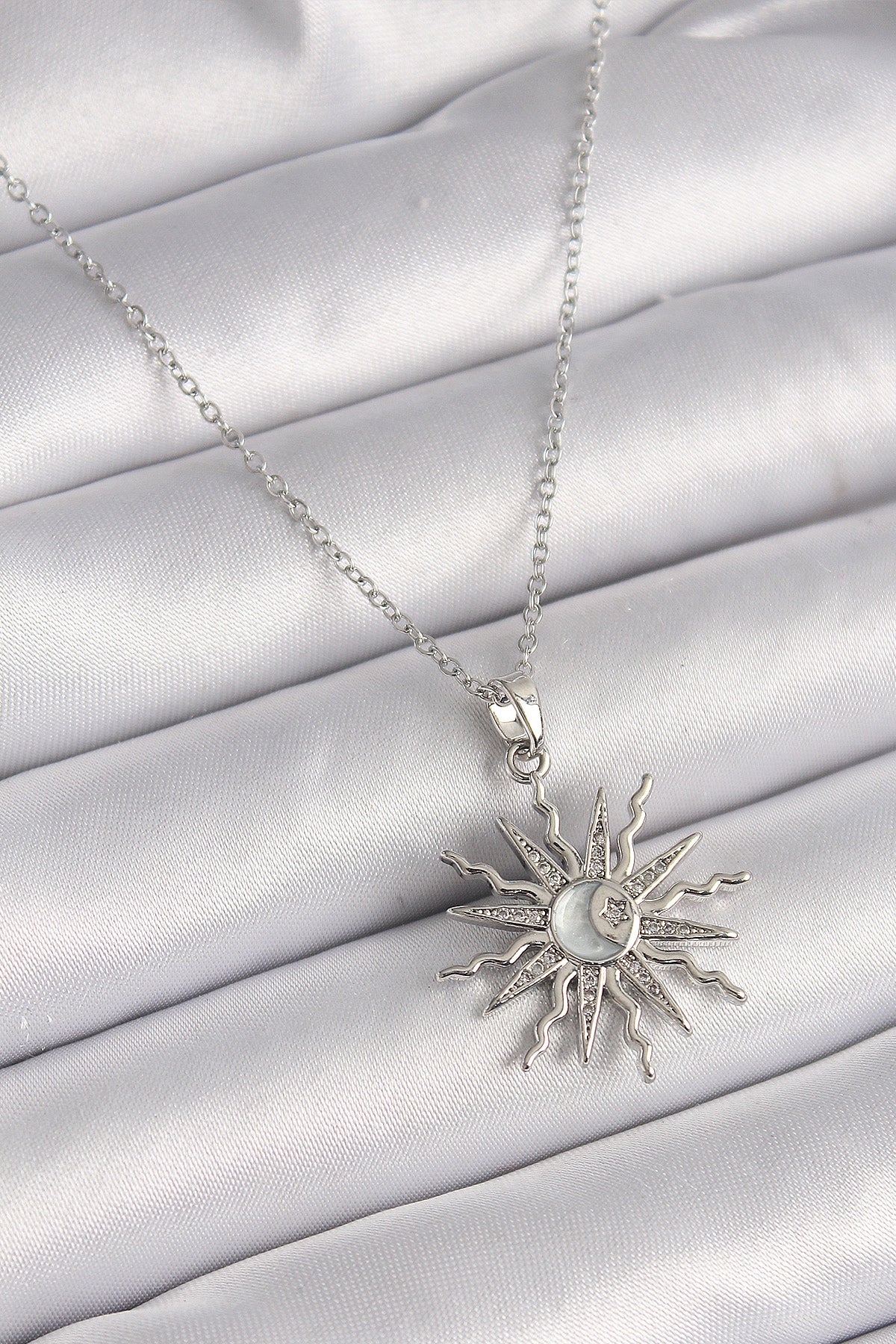 BKO9631 - 316L Çelik Gümüş Renk Zincir Zirkon Taşlı Güneş Model Sedefli Ay İşleme Detay Kadın Kolye