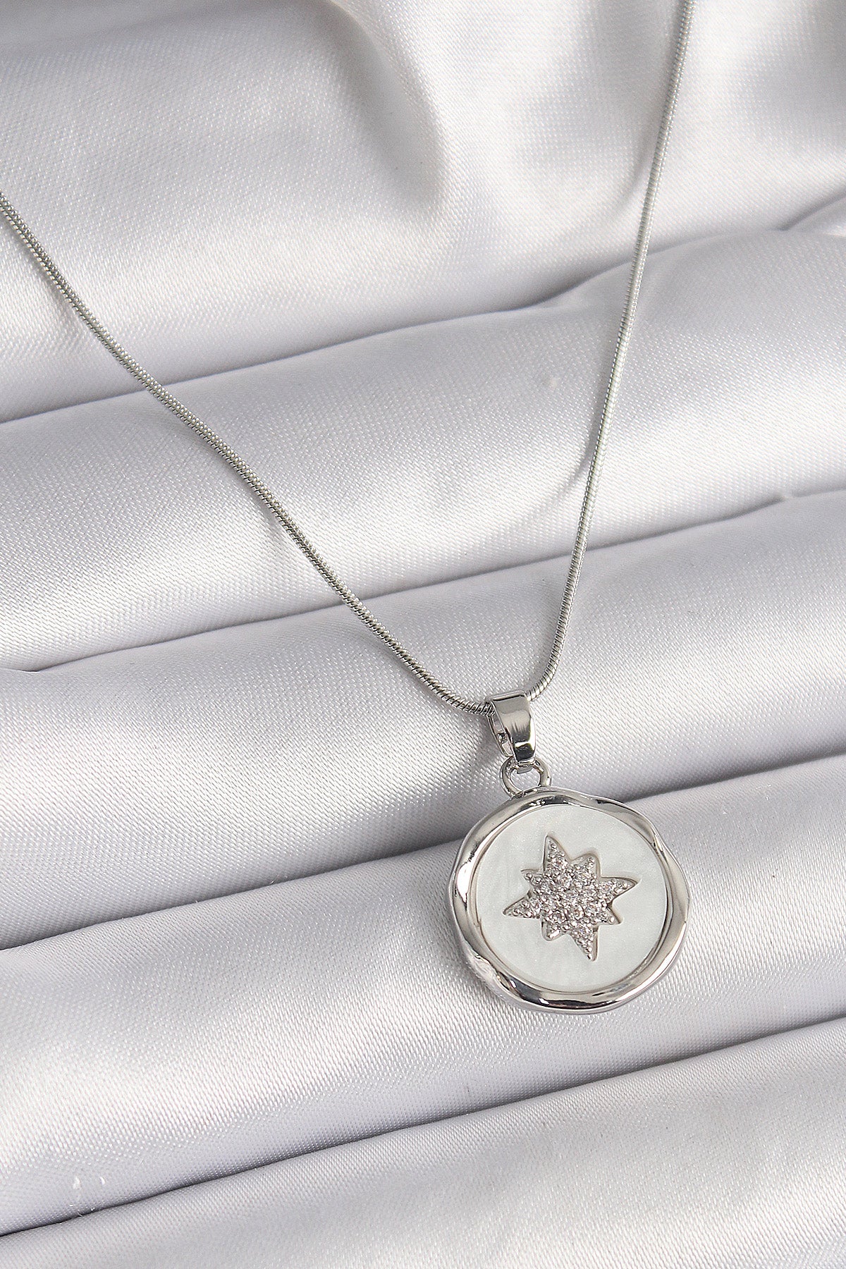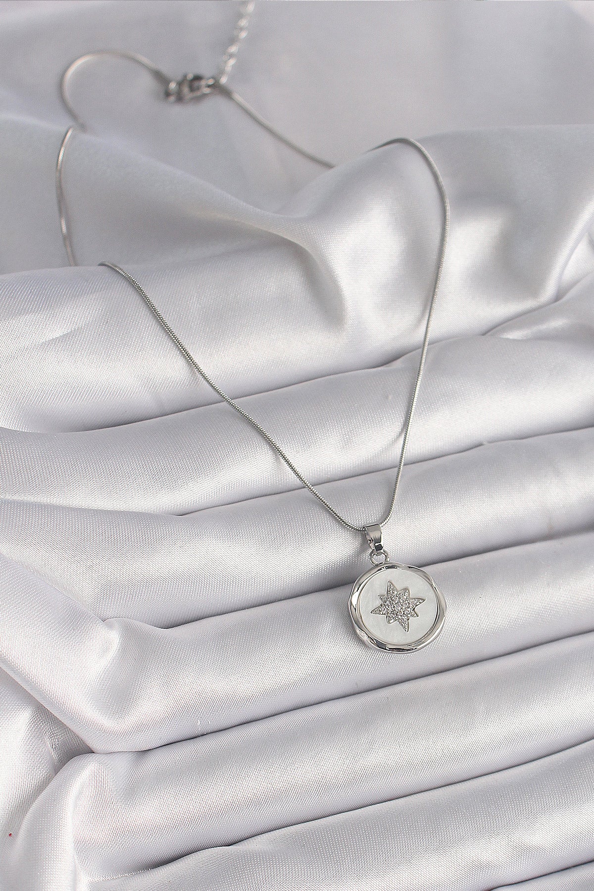 BKO9635 - 316L Çelik Gümüş Renk Zincir Beyaz Sedefli Zirkon Taşlı Yıldız İşleme Model Kadın Kolye