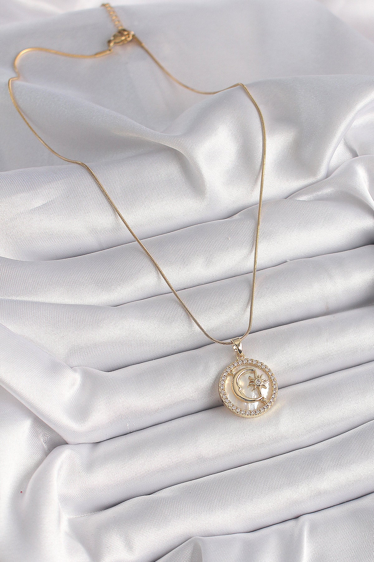 Ürün Adı: | 316L Çelik Gold Renk Zincir Zirkon Taş Detaylı Beyaz Sedefli Ay Yıldız Model Kadın Kolye |