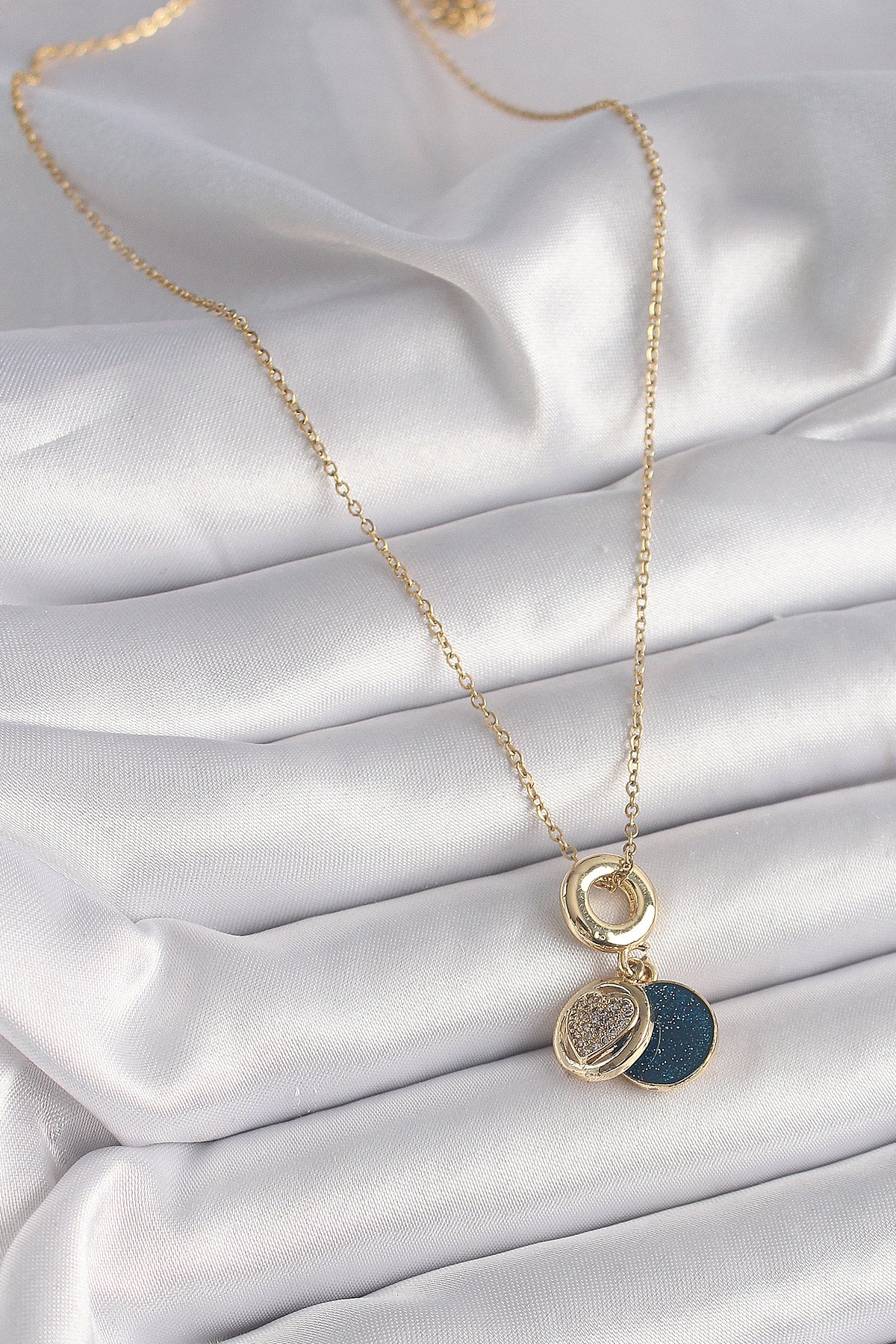 BKO9640 - 316L Çelik Gold Renk Zincir Zirkon Taşlı Kalp Model Mavi Simli Kadın Kolye