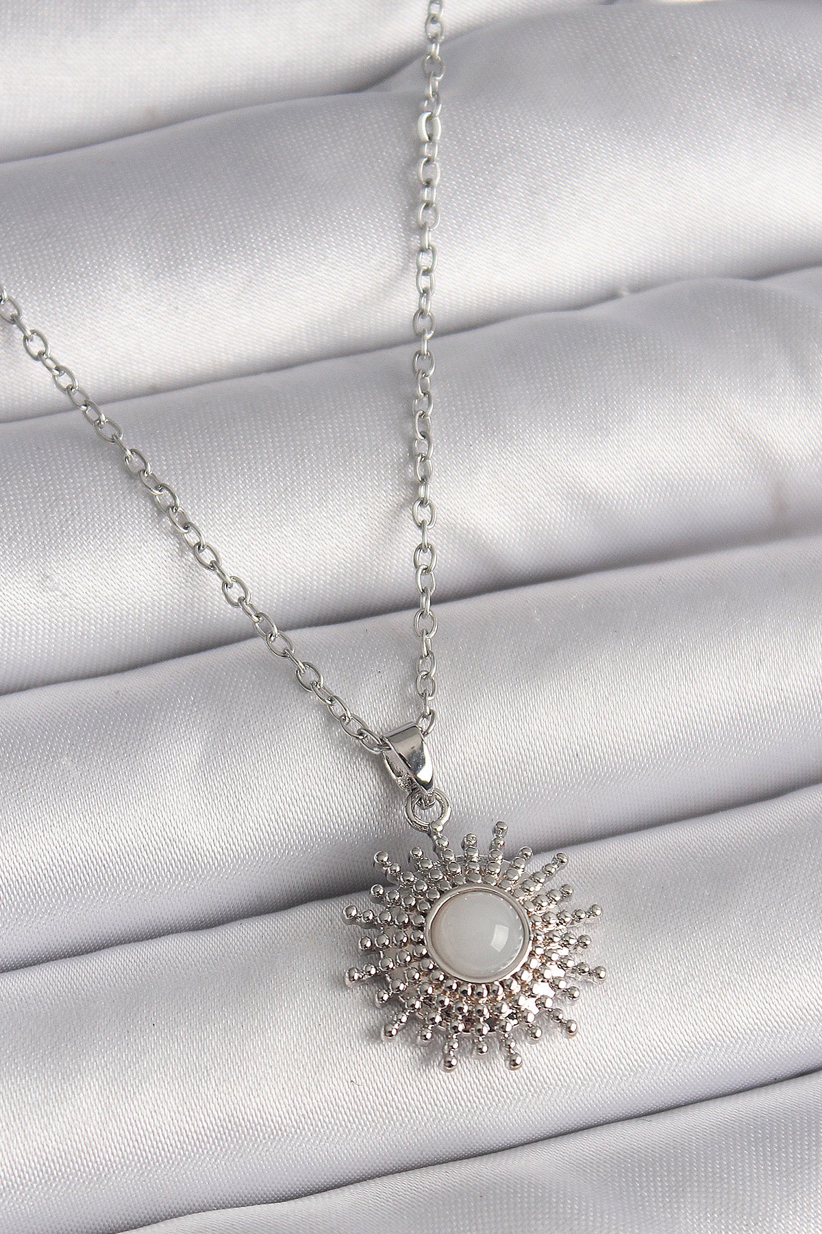 BKO9719 - 316L Çelik Gümüş Renk Zincir Beyaz Mineli Güneş Model Kadın Kolye