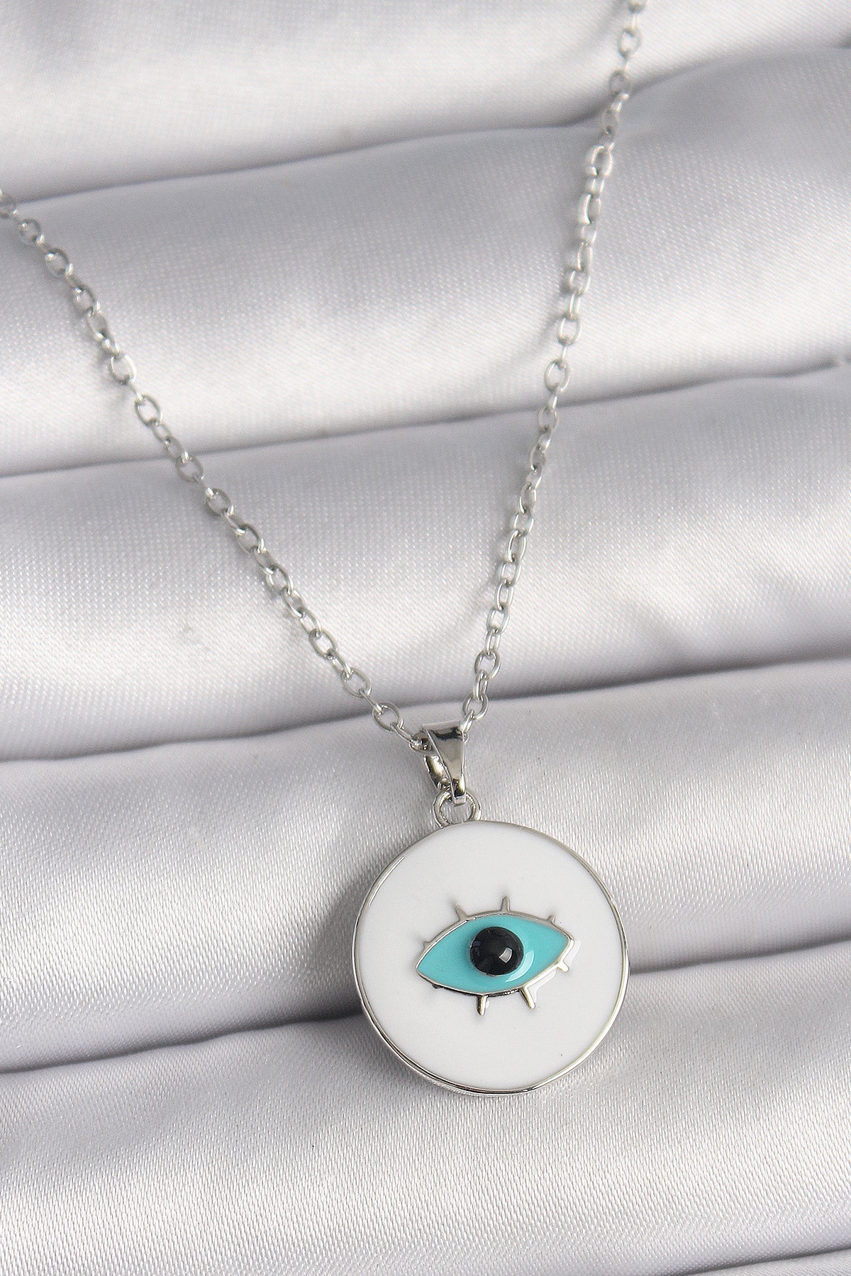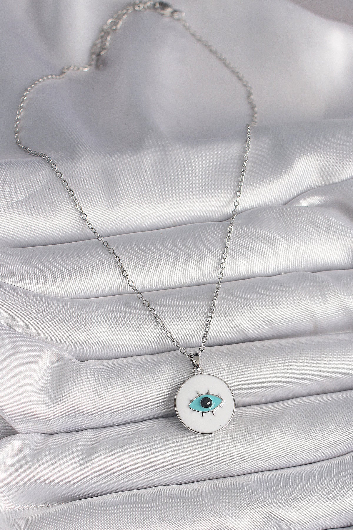BKO9729 - 316L Çelik Gümüş Renk Zincir Beyaz Mineli Turkuaz Göz İşleme Model Kadın Kolye