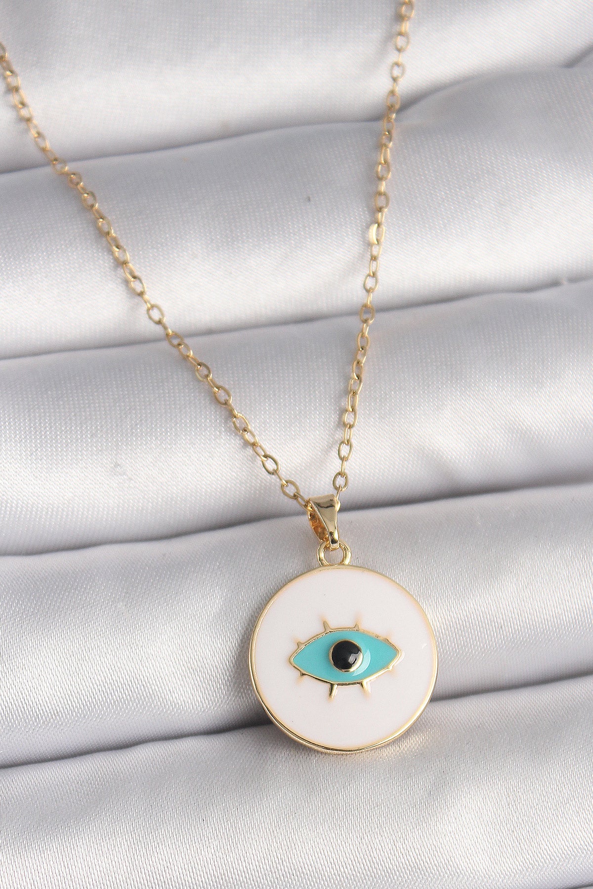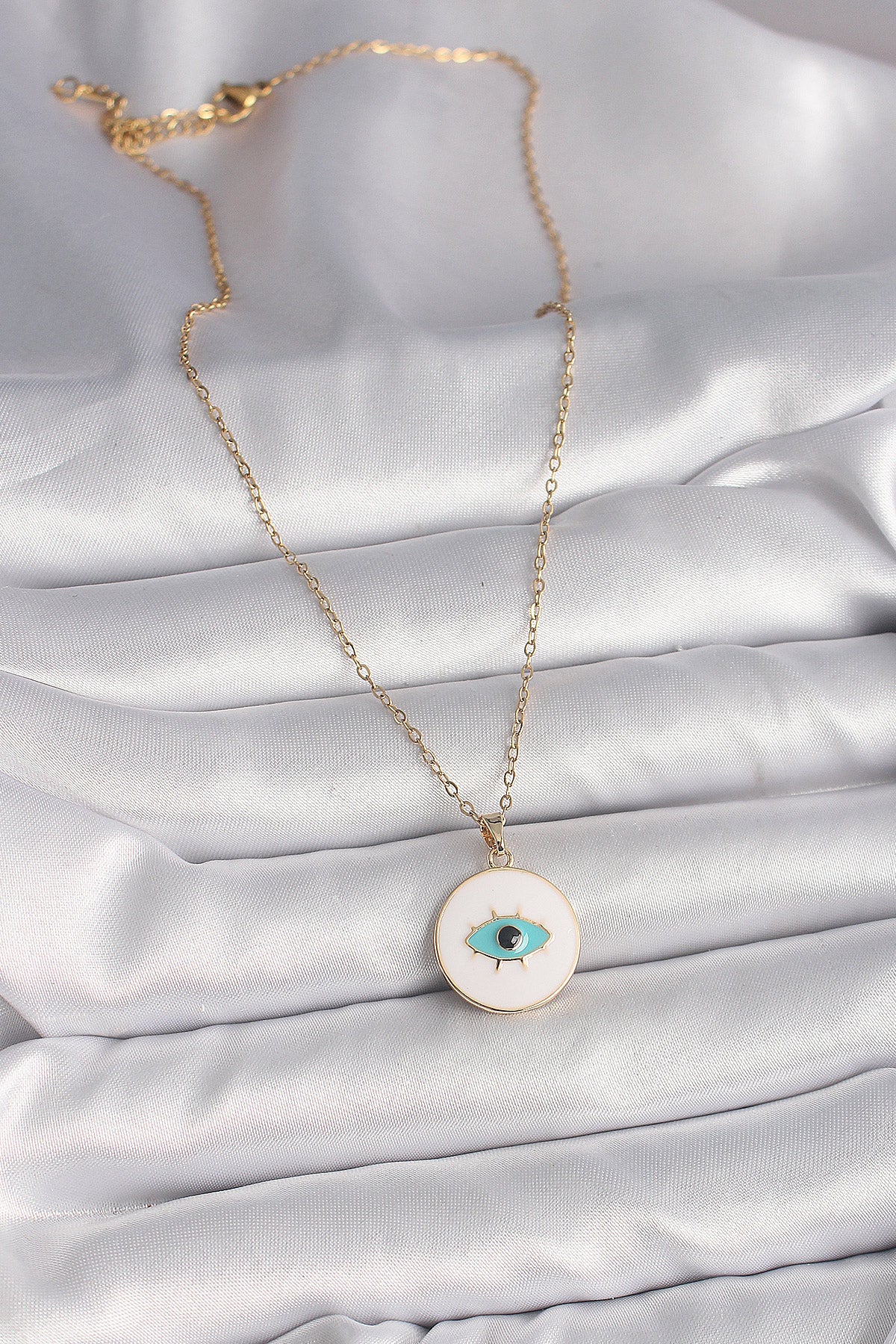 Ürün Adı: | 316L Çelik Gold Renk Zincir Beyaz Mineli Turkuaz Göz İşleme Model Kadın Kolye |