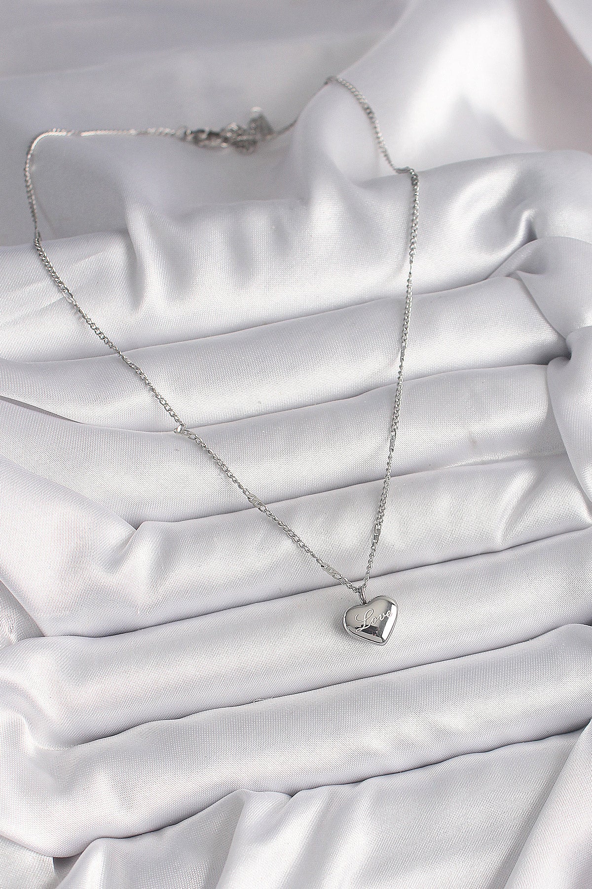 BKO9779 - 316L Çelik Gümüş Renk Zincir Love İşleme Kalp Figür Kadın Kolye