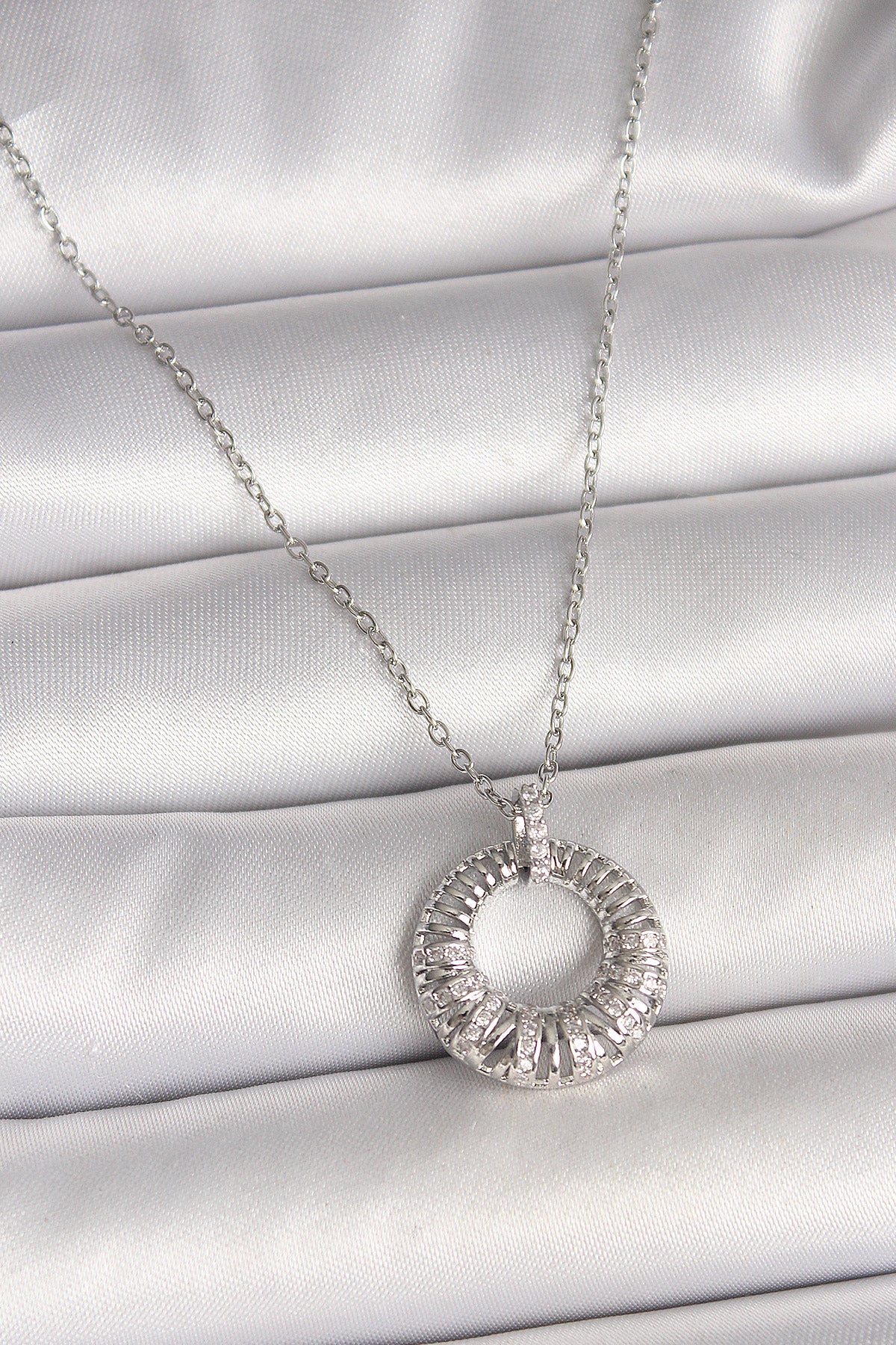 BKO9969 - 316L Çelik Gümüş Renk Zincir Zirkon Taş İşlemeli Daire Model Kadın Kolye
