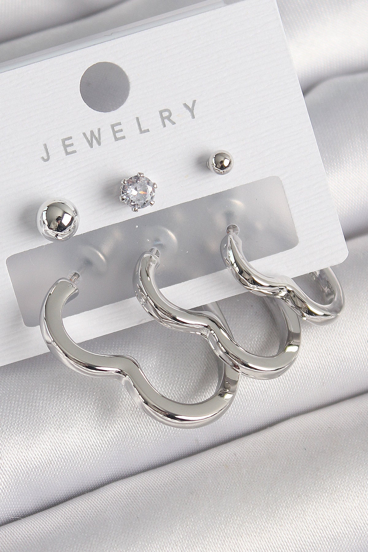 BKP10307 - Pirinç Gümüş Renk Kalp Model Zirkon Taş Topçuk Detay Kadın Küpe Seti