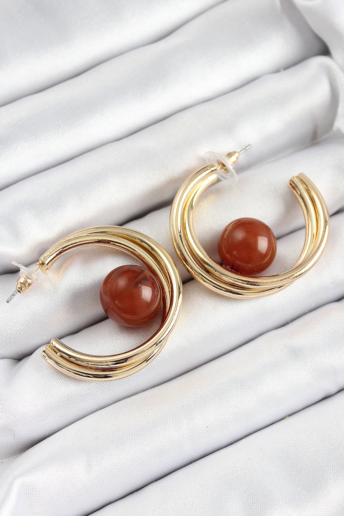 BKP10364 - Pirinç Gold Renk Halka Model Kahverengi Boncuk Detay Kadın Küpe