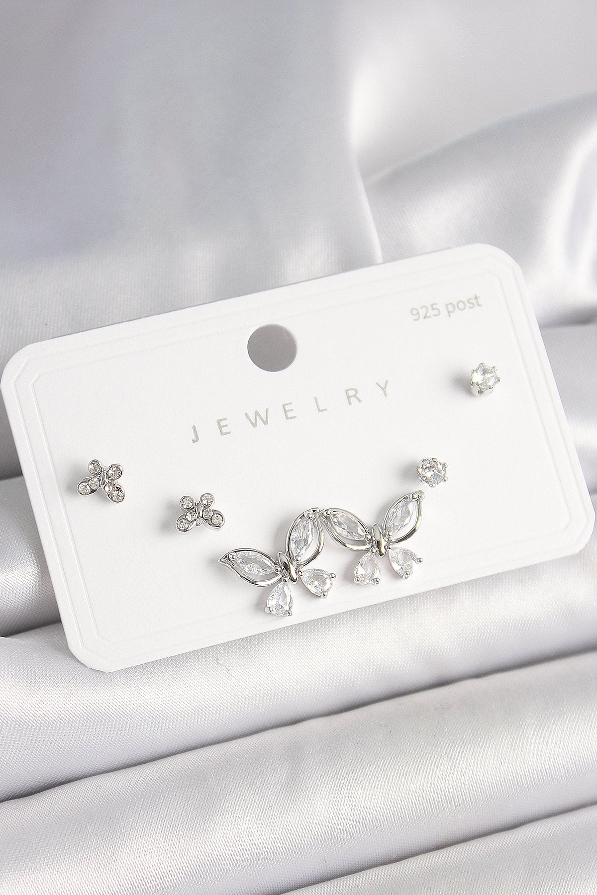 BKP10394 - 925 Ayar Gümüş Çivi Pirinç Gümüş Renk Zirkon Taşlı Kelebek Model Kadın Küpe Seti
