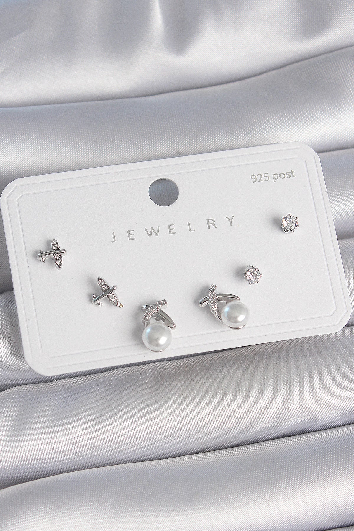 BKP10479 - Pirinç Gümüş Renk Zirkon Taşlı Kelebek Model İnci Detay 925 Ayar Gümüş Çivi Kadın Küpe Seti