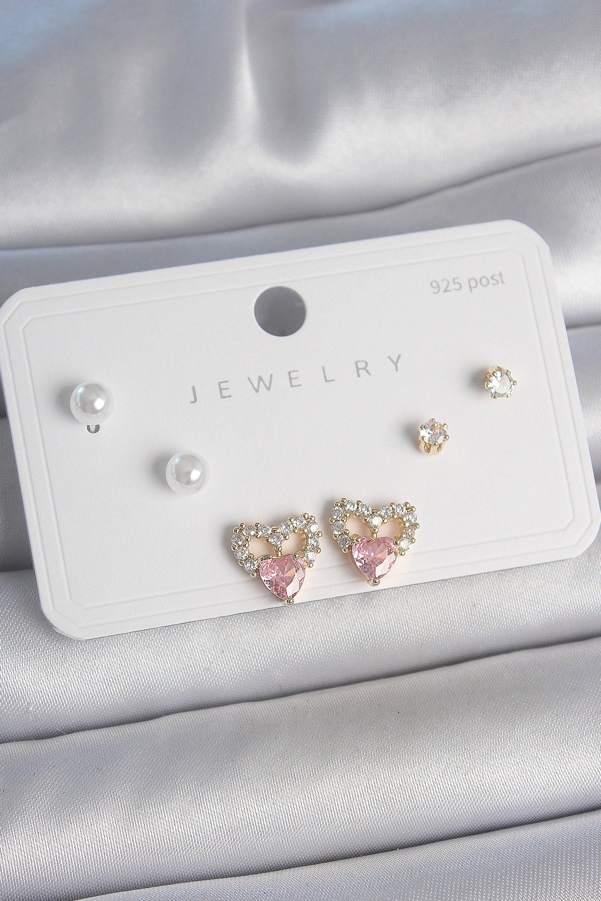 - Ürün Adı: Pirinç Gold Renk Pembe Zirkon Taşlı Kalp Model İnci Detay 925 Ayar Kadın Küpe Seti