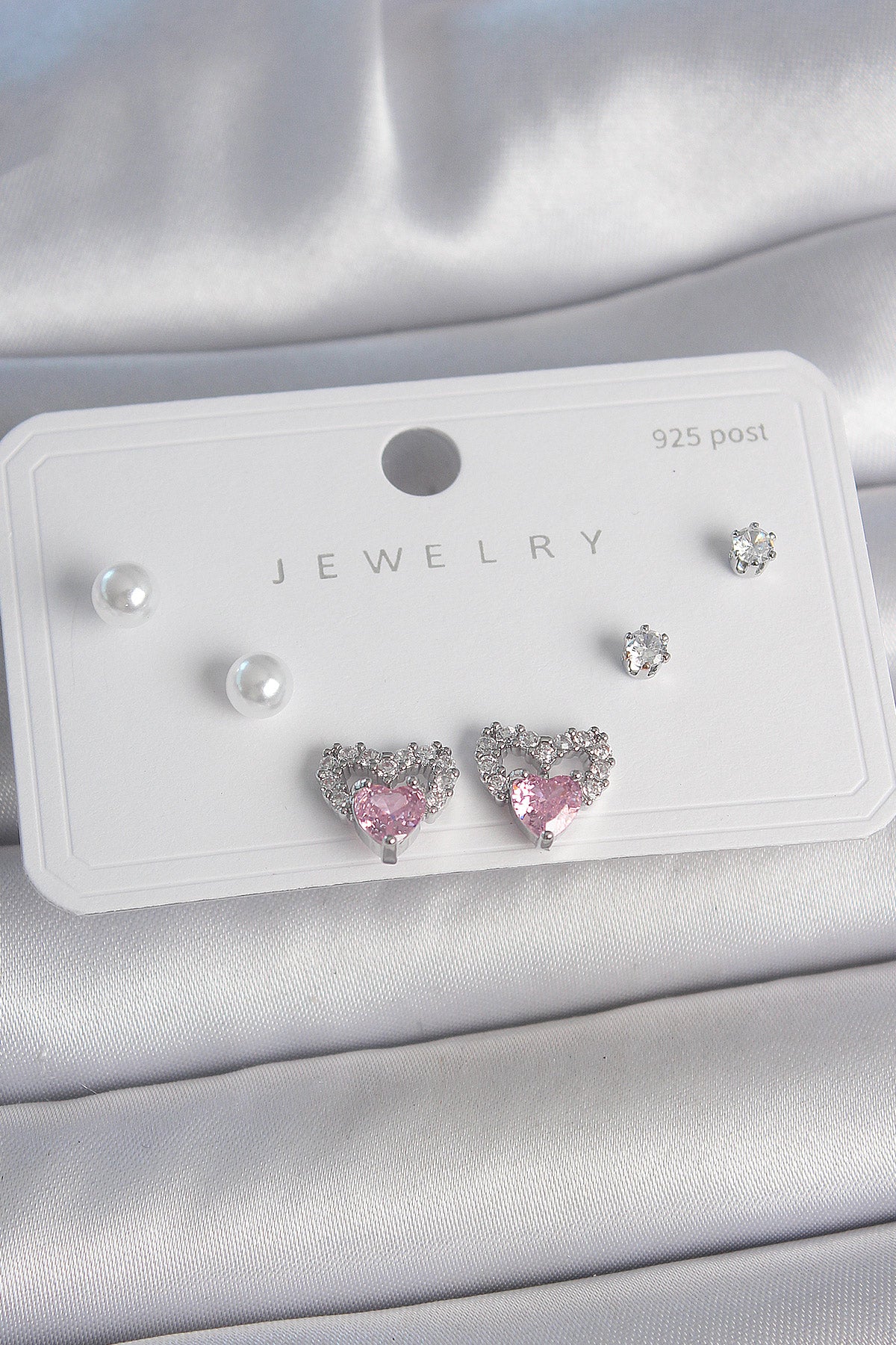 - Ürün Adı: Pirinç Gümüş Renk Pembe Zirkon Taşlı Kalp Model İnci Detay 925 Ayar Gümüş Çivi Kadın Küpe Seti