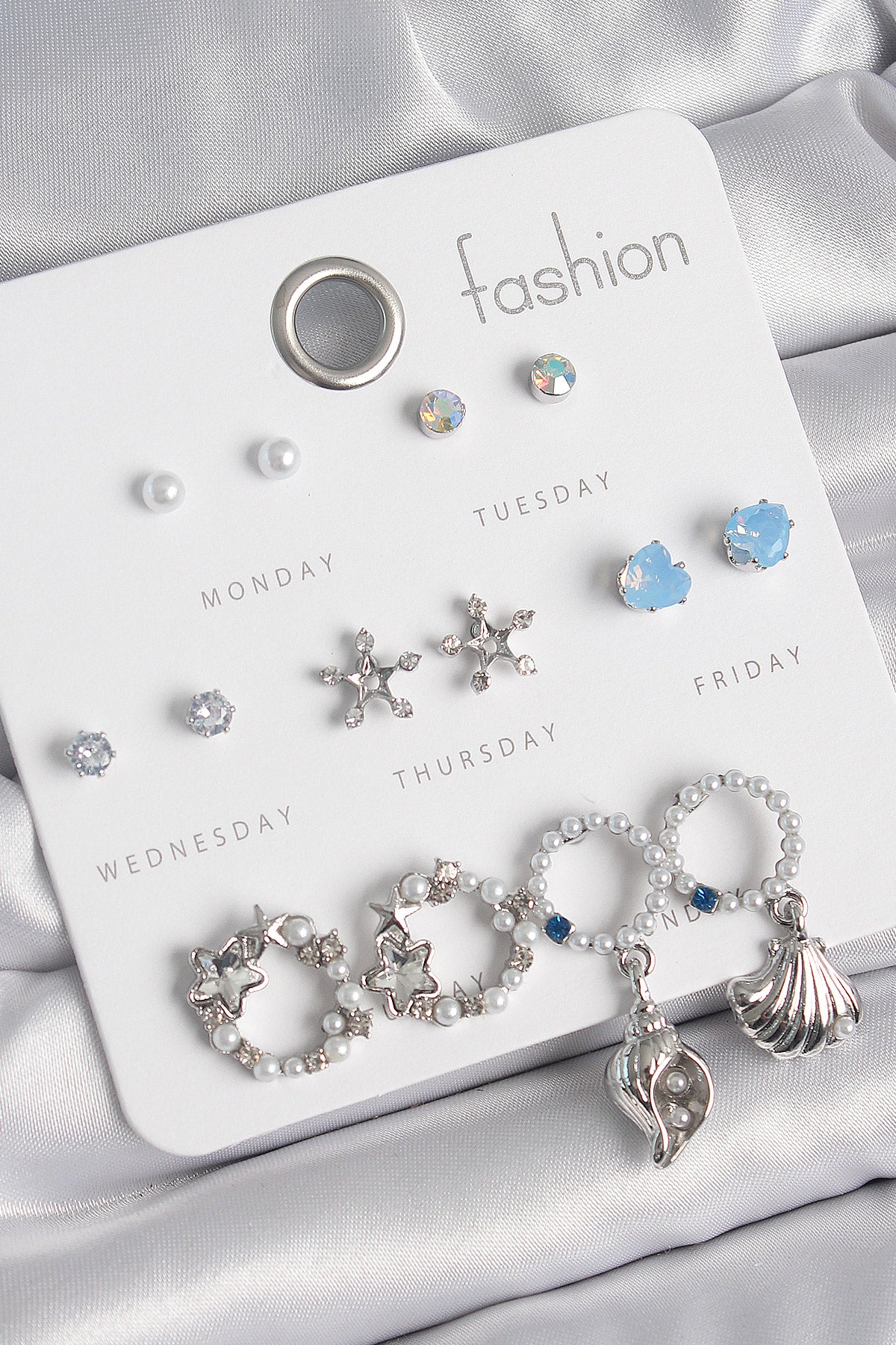 BKP10547 - Pirinç Gümüş Renk İncli Zirkon Taşlı Halka Figür Yıldız Detay 7 Çift Kadın Küpe Seti