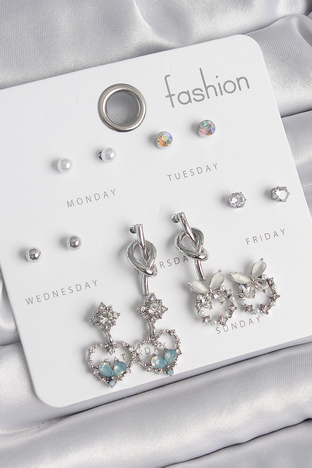 BKP10548 - Pirinç Gümüş Renk Sallantı Zirkon Taşlı Kalp Model Düğüm Detay 7 Çift Kadın Küpe Seti