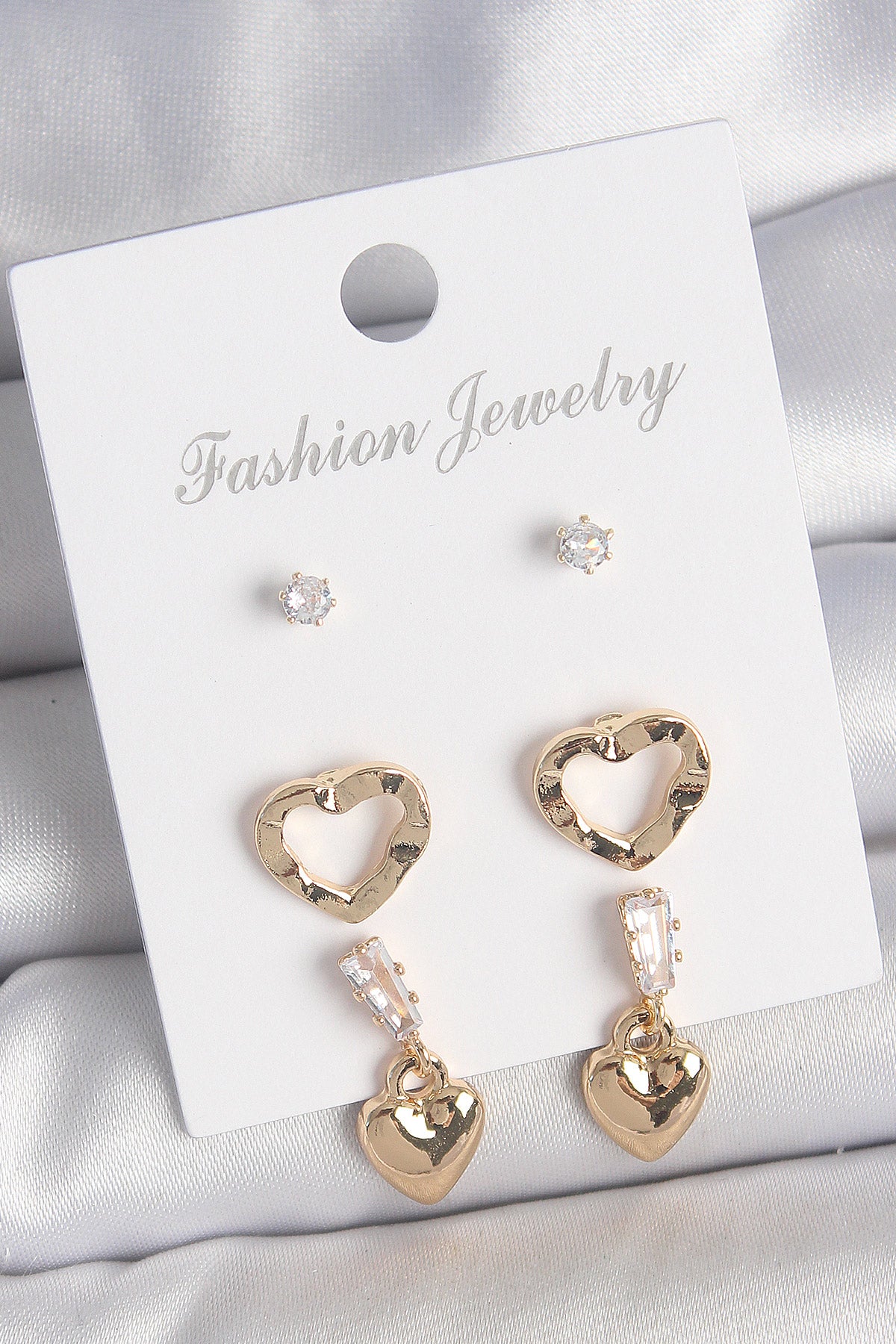 BKP10613 - Pirinç Gold Renk Zirkon Taşlı Sallantı Kalp Model Kadın 3 Çift Küpe Seti