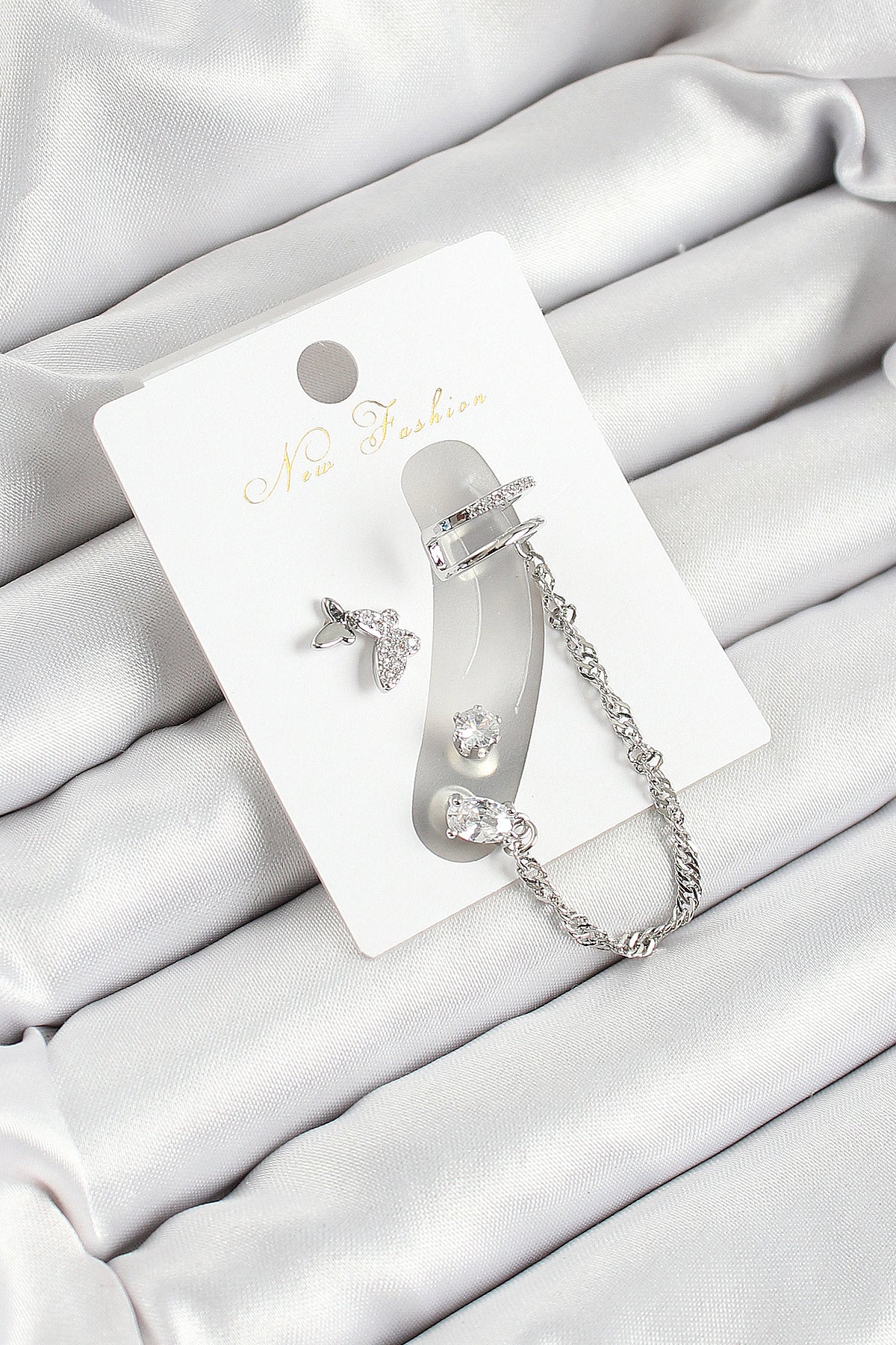 BKP10659 - Pirinç Kelebek Figürlü Zirkon Taşlı Gümüş Renk 3'lü Kıkırdak Kadın Küpe Set