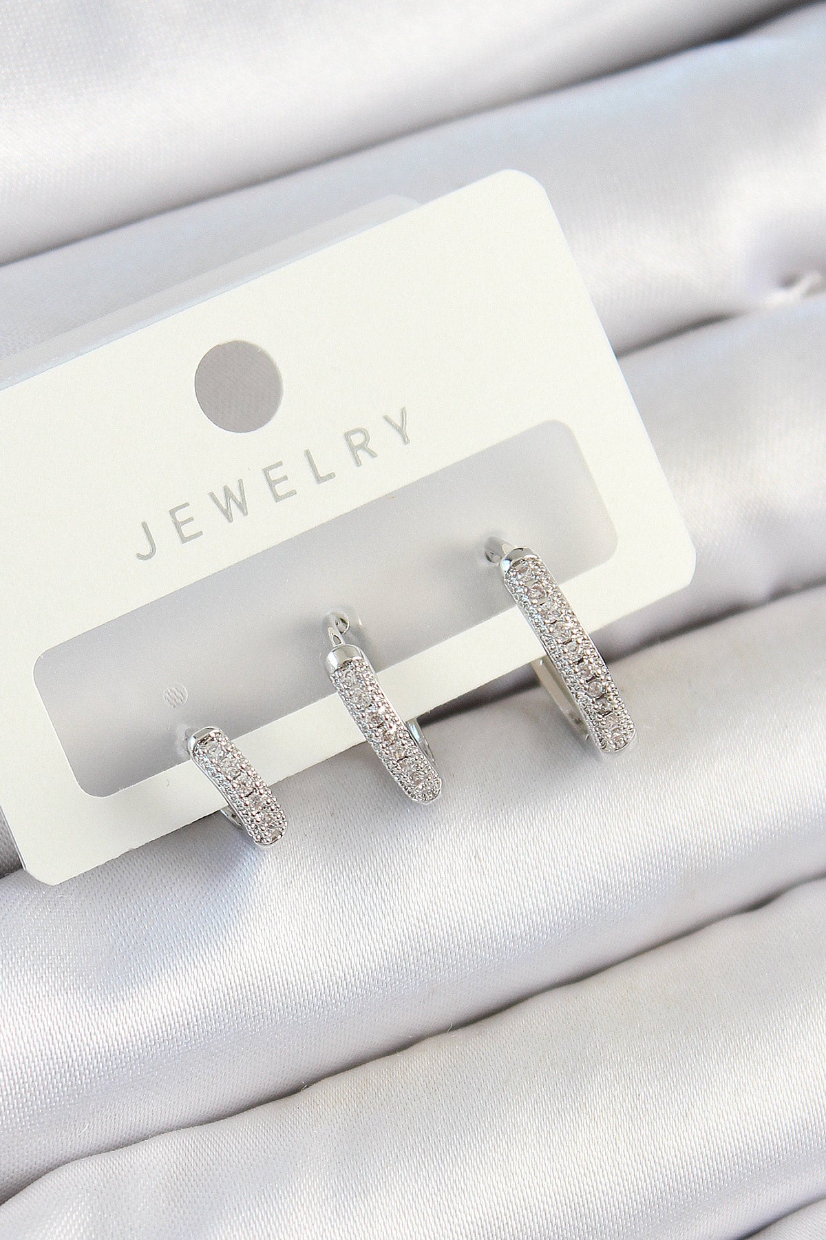 - Ürün Adı: Pirinç Zirkon Taşlı Halka Model Gümüş Renk 3'lü Çift Kadın Küpe Set