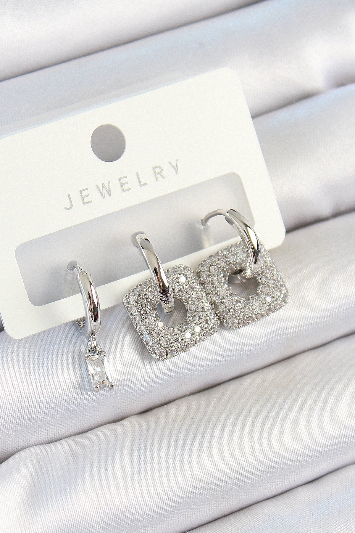 - Ürün Adı: Pirinç Zirkon Taşlı Kare Model Gümüş Renk 3'lü Çift Kadın Küpe Set