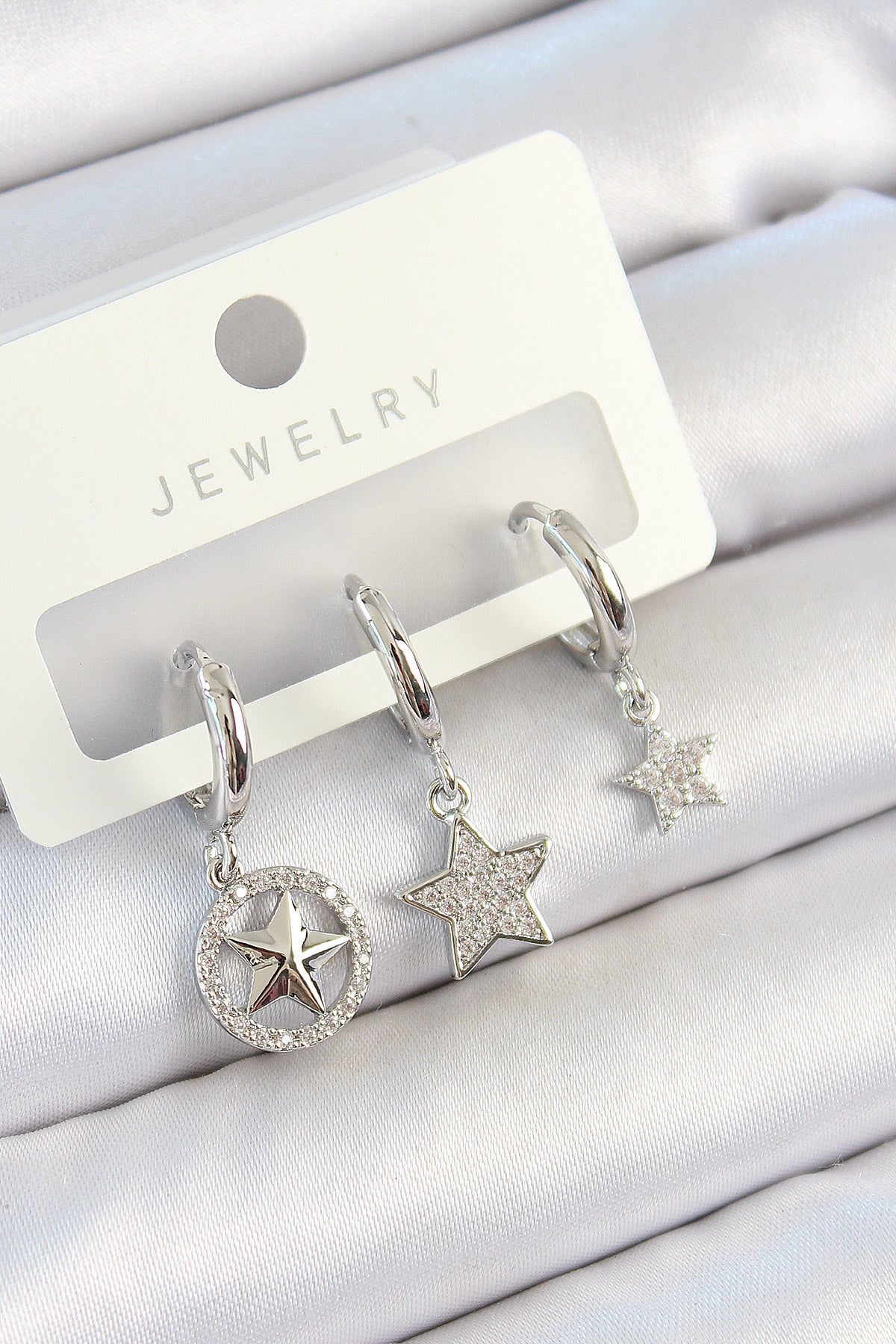 - Ürün Adı: Pirinç Zirkon Taşlı Yıldız Model Gümüş Renk 3'lü Çift Kadın Küpe Set