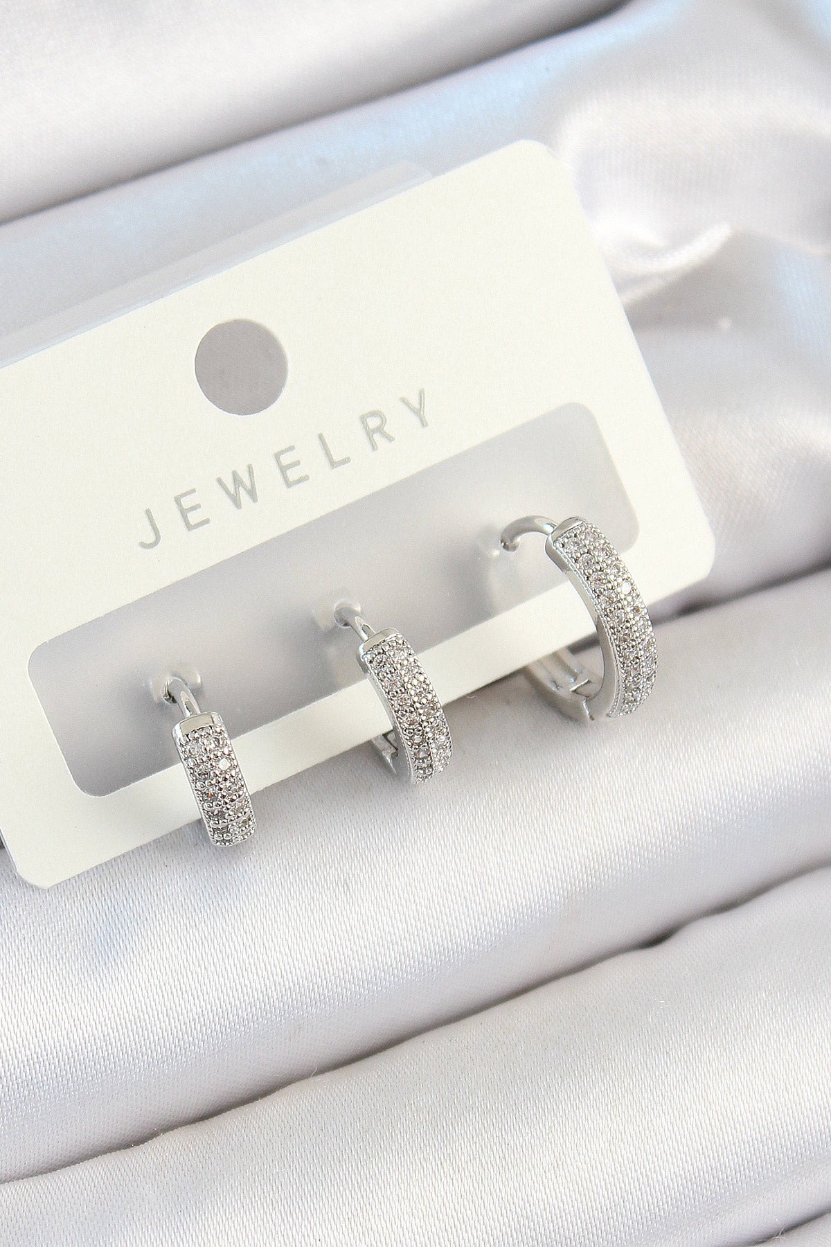- Ürün Adı: Pirinç Zirkon Taşlı Halka Model Gümüş Renk 3'lü Çift Kadın Küpe Set