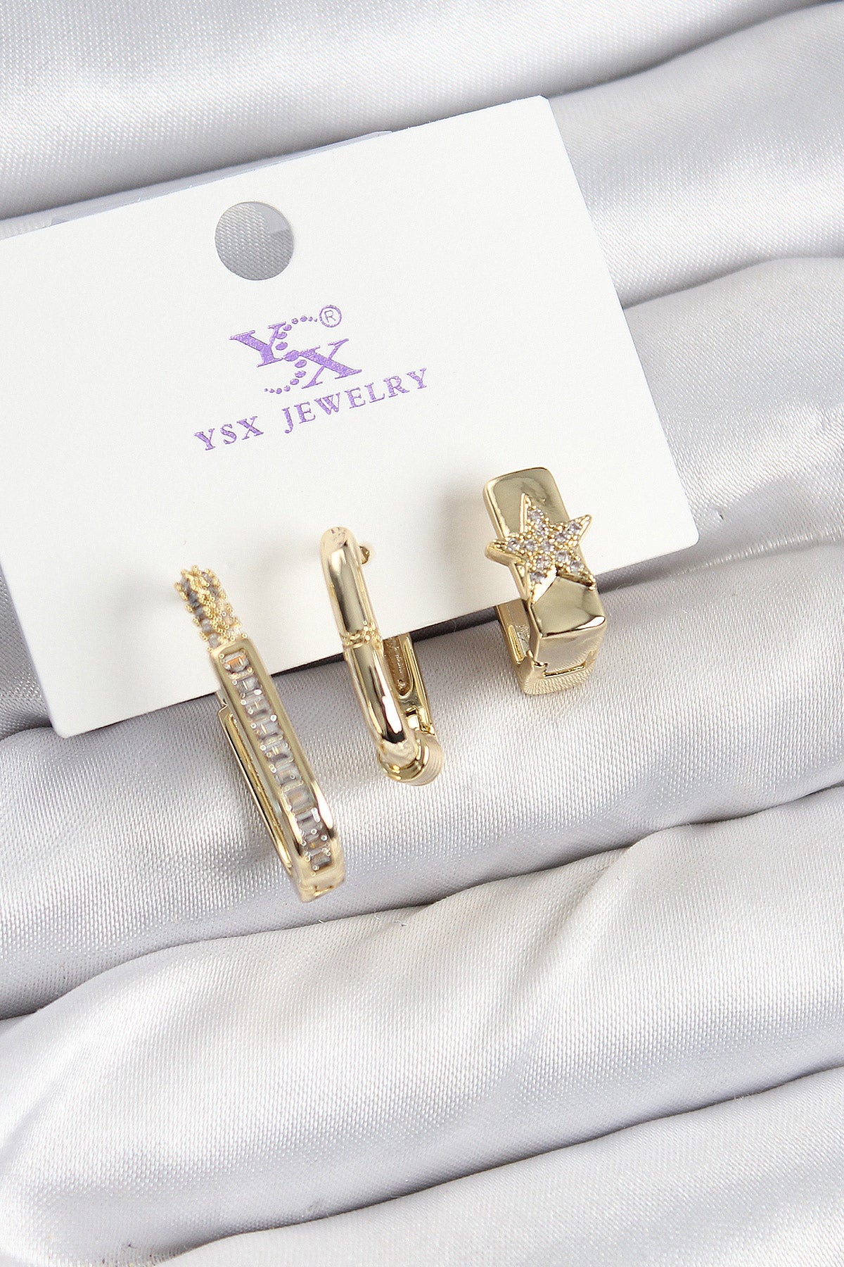 - Ürün Adı: Pirinç Zİrkon Taşlı Yıldız Model Gold Renk 3'lü Kadın Küpe