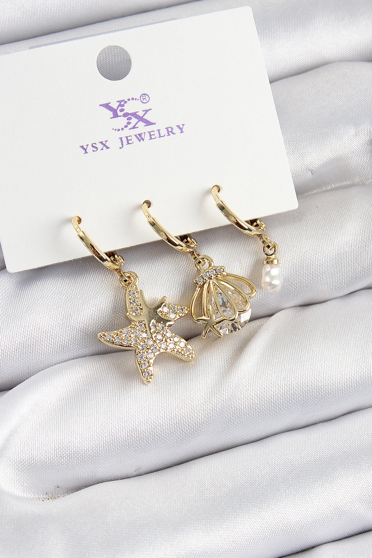 - Ürün Adı: Pirinç Zİrkon Taşlı Deniz Yıldızı Ve İstiridye Model Gold Renk 3'lü Kadın Küpe