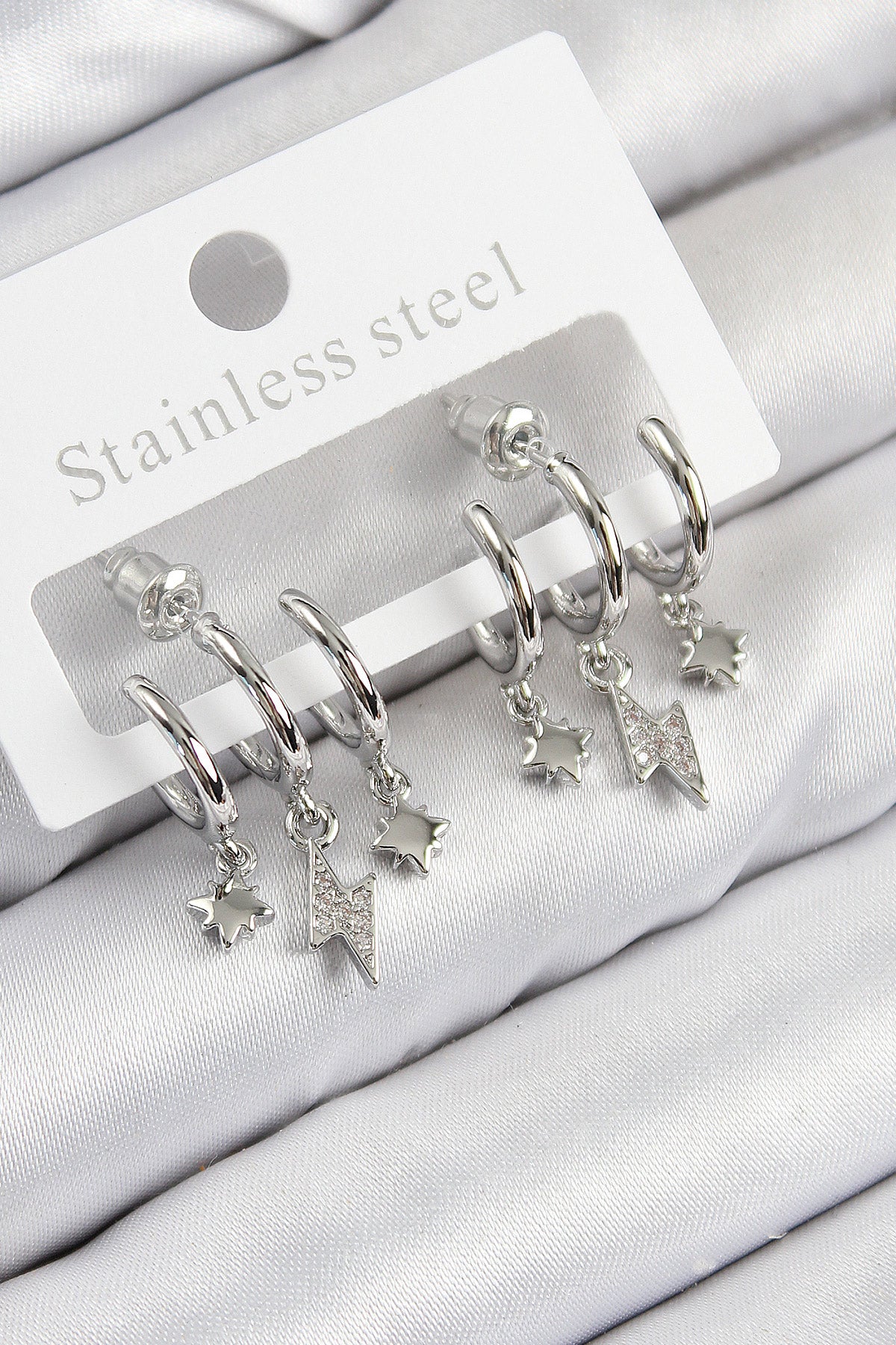 - Ürün Adı: Pirinç Zirkon Taşlı Şimşek Model Gümüş Renk Kadın Küpe