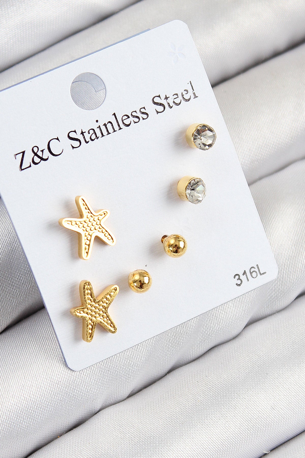 BKP11120 - 316L Çelik Zirkon Taşlı Deniz Yıldızı Model Gümüş Renk Kadın Set Küpe