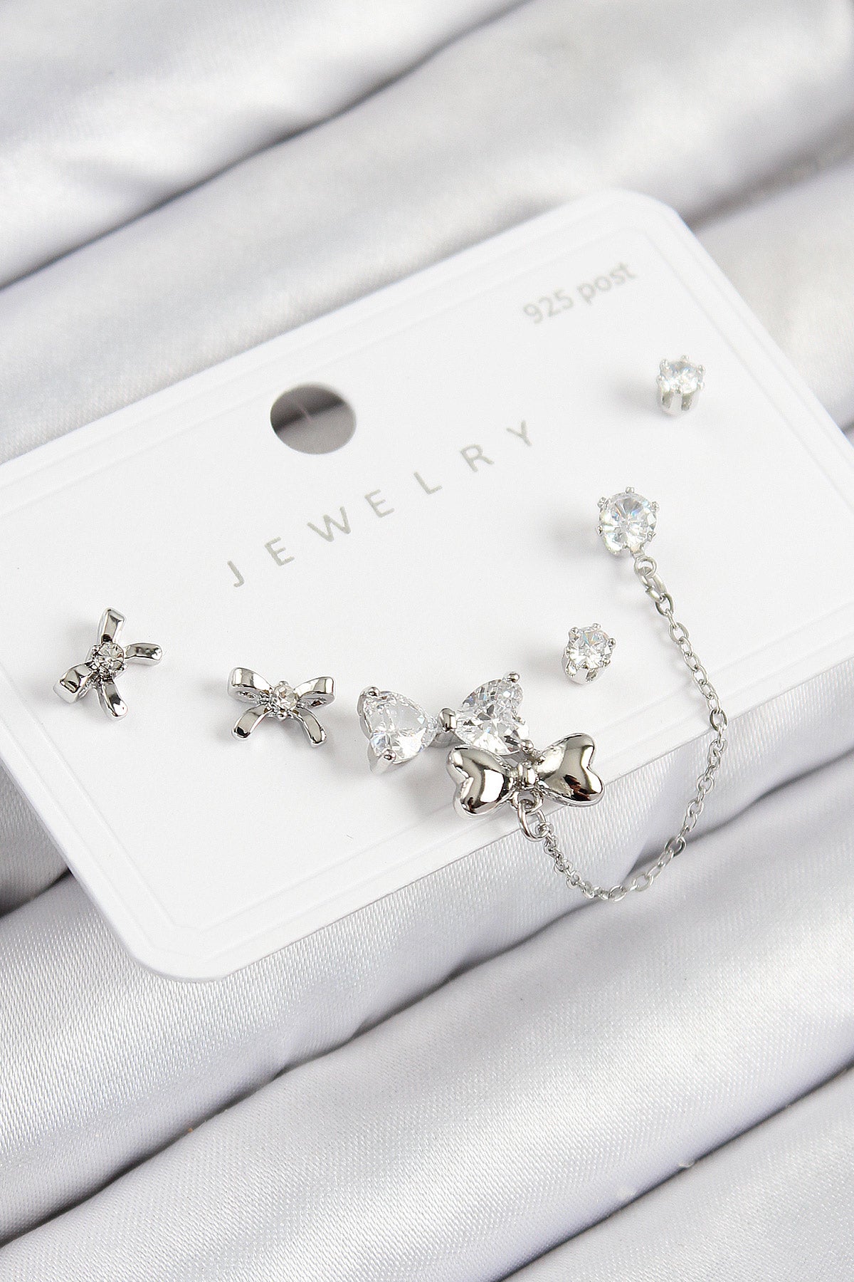 - Ürün Adı: Pirinç Zirkon Taşlı Fiyonk Model Gümüş Renk 925 Ayar Gümüş Çivi Kadın Küpe Set