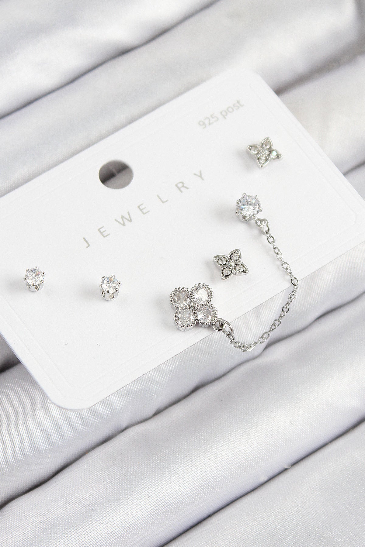 - Ürün Adı: Pirinç Zirkon Taşlı Yonca Model Gümüş Renk 925 Ayar Gümüş Çivi Kadın Küpe Set
