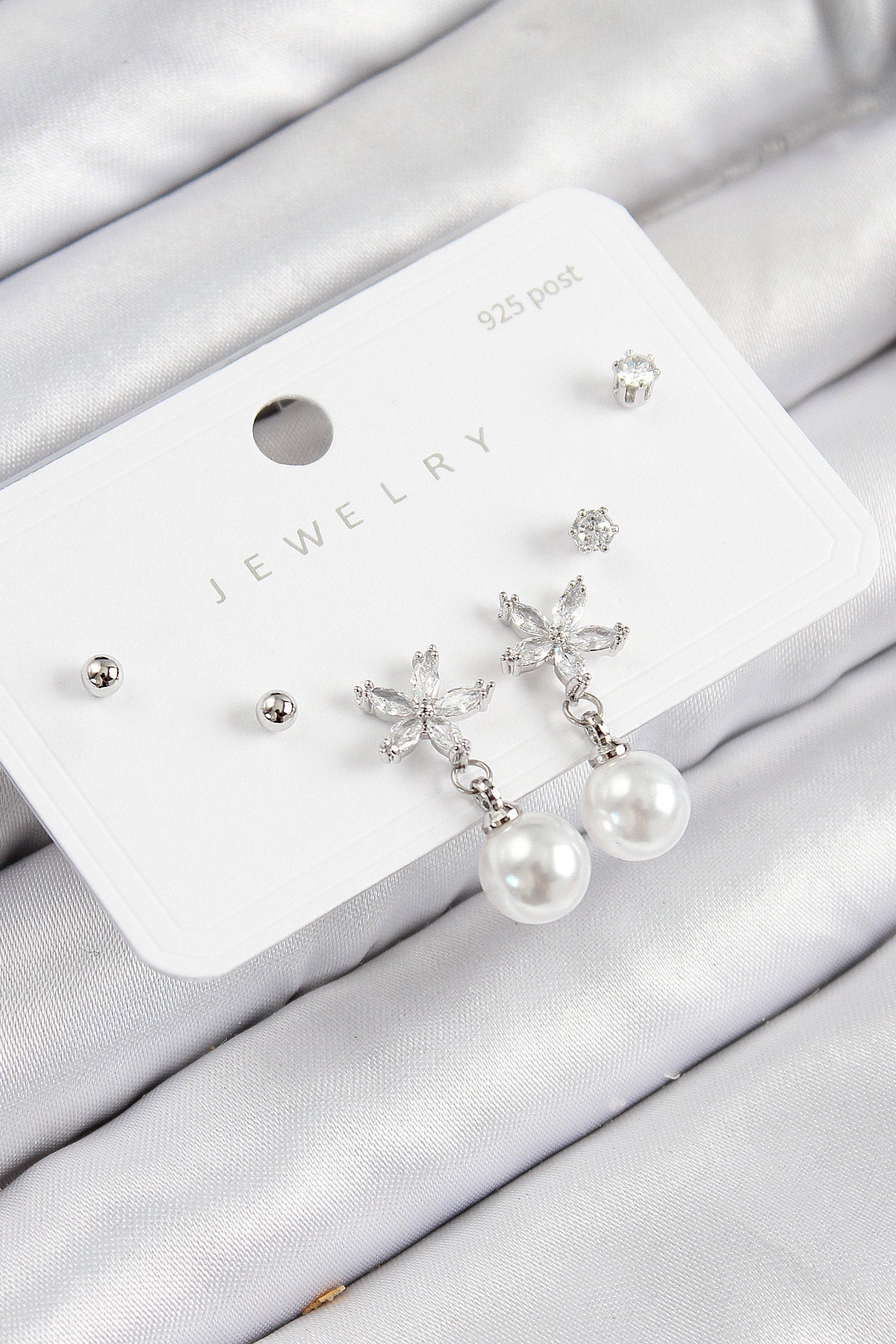 - Ürün Adı: Pirinç Zirkon Taşlı İnci Sallantılı Çiçek Model Gümüş Renk 925 Ayar Gümüş Çivi Kadın Küpe Set