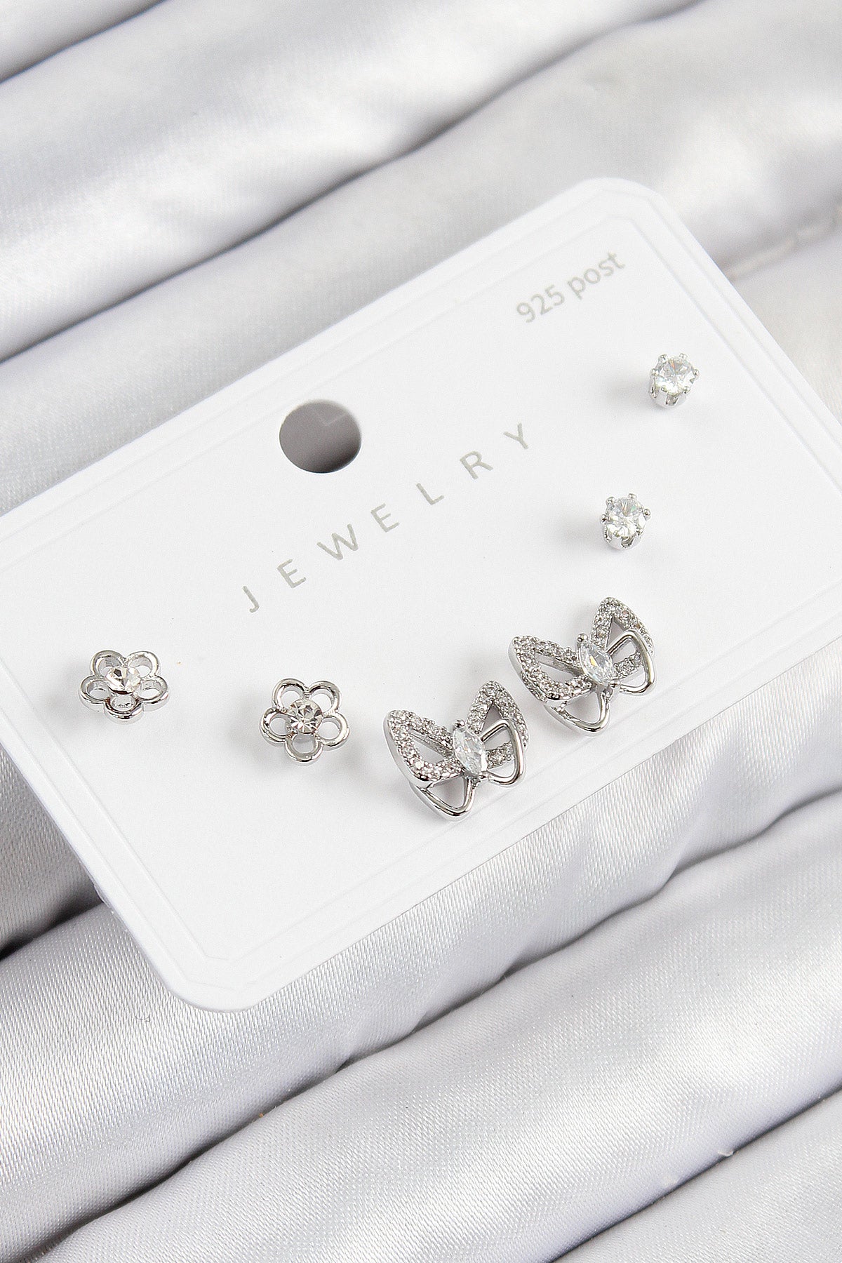 - Ürün Adı: Pirinç Zirkon Taşlı Kelebek Model Gümüş Renk 925 Ayar Gümüş Çivi Kadın Küpe Set