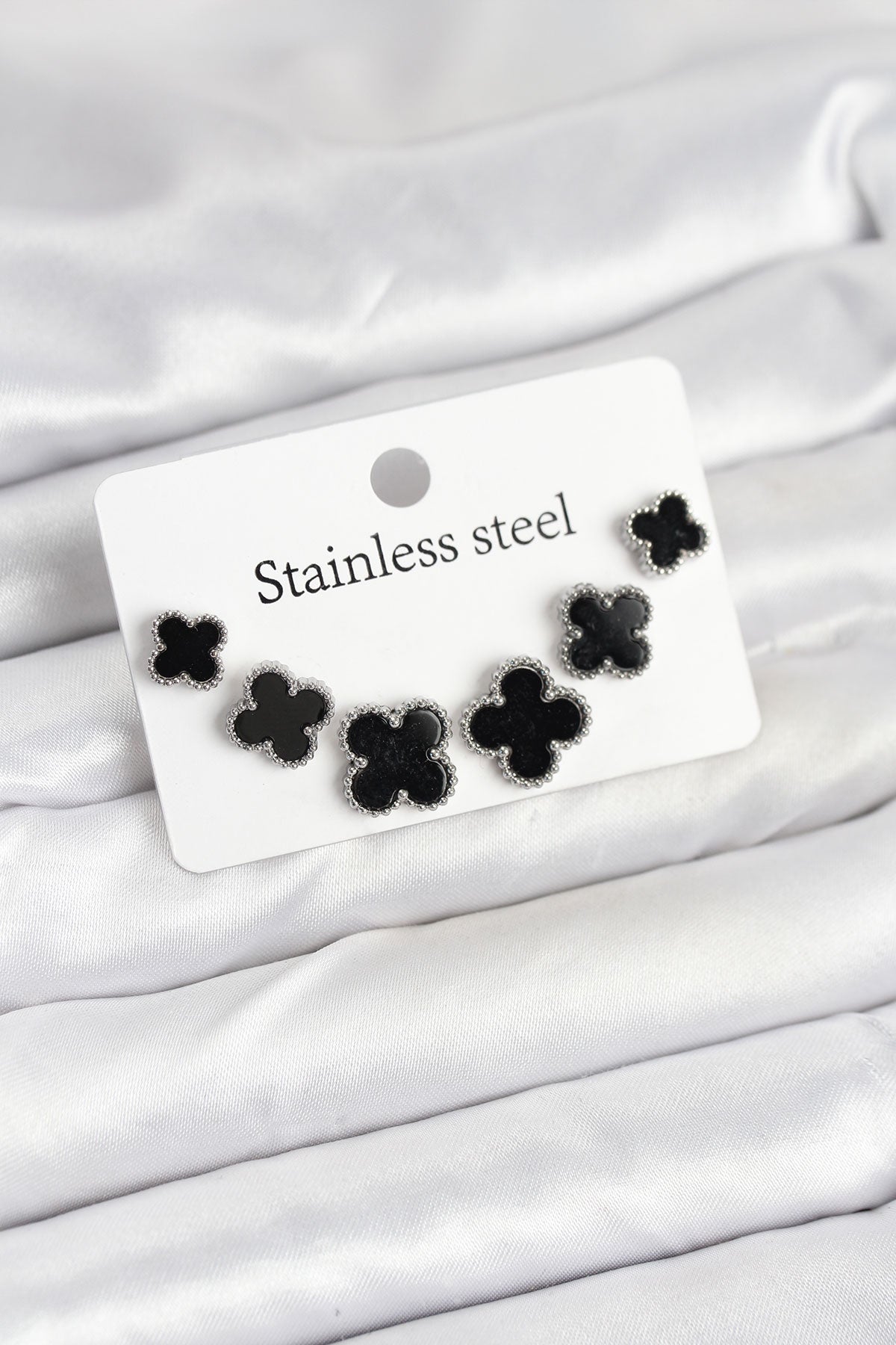 BKP11234 - 316L Çelik Gümüş Siyah Renk 3 Boy Yonca Küpe Seti