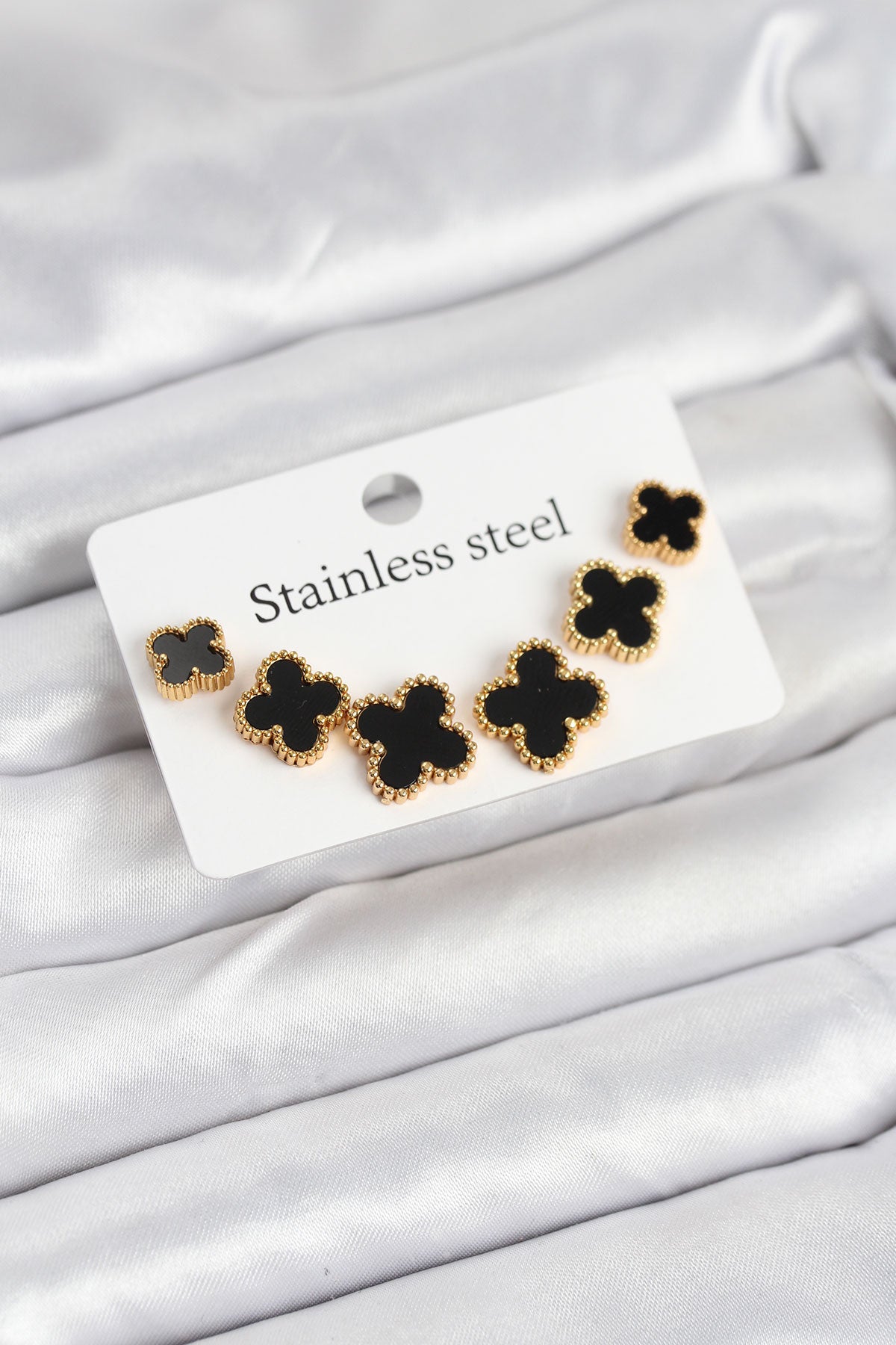 BKP11235 - 316L Çelik Gold Siyah Renk 3 Boy Yonca Küpe Seti