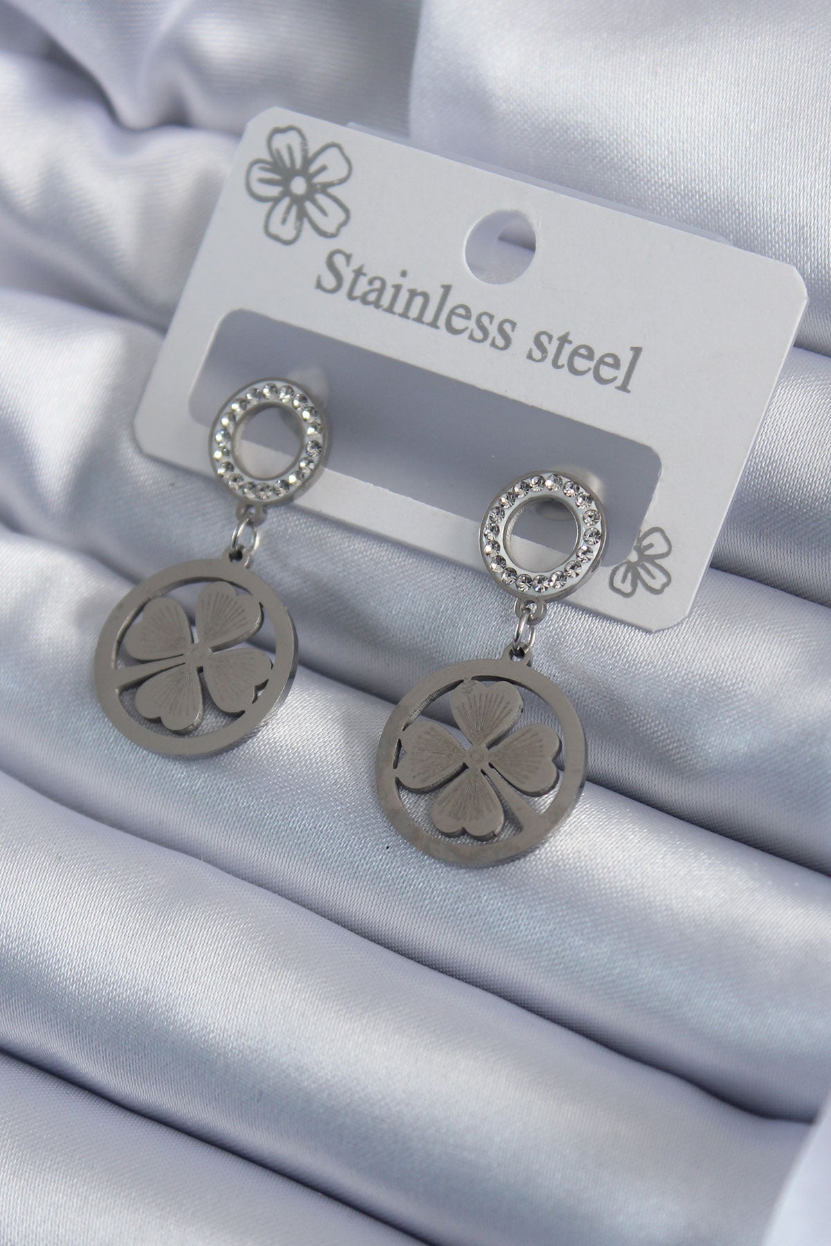 - Ürün Adı: 316L Çelik Gümüş Renk Zirkon Taşlı Yonca Model İşleme Detay Kadın Küpe