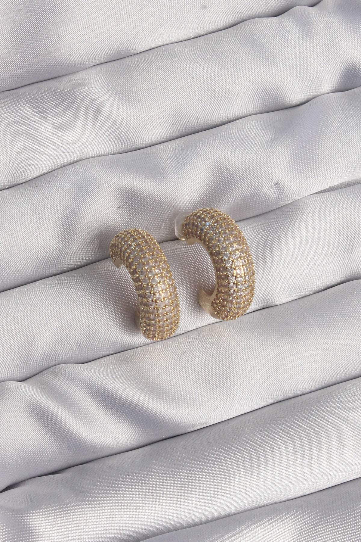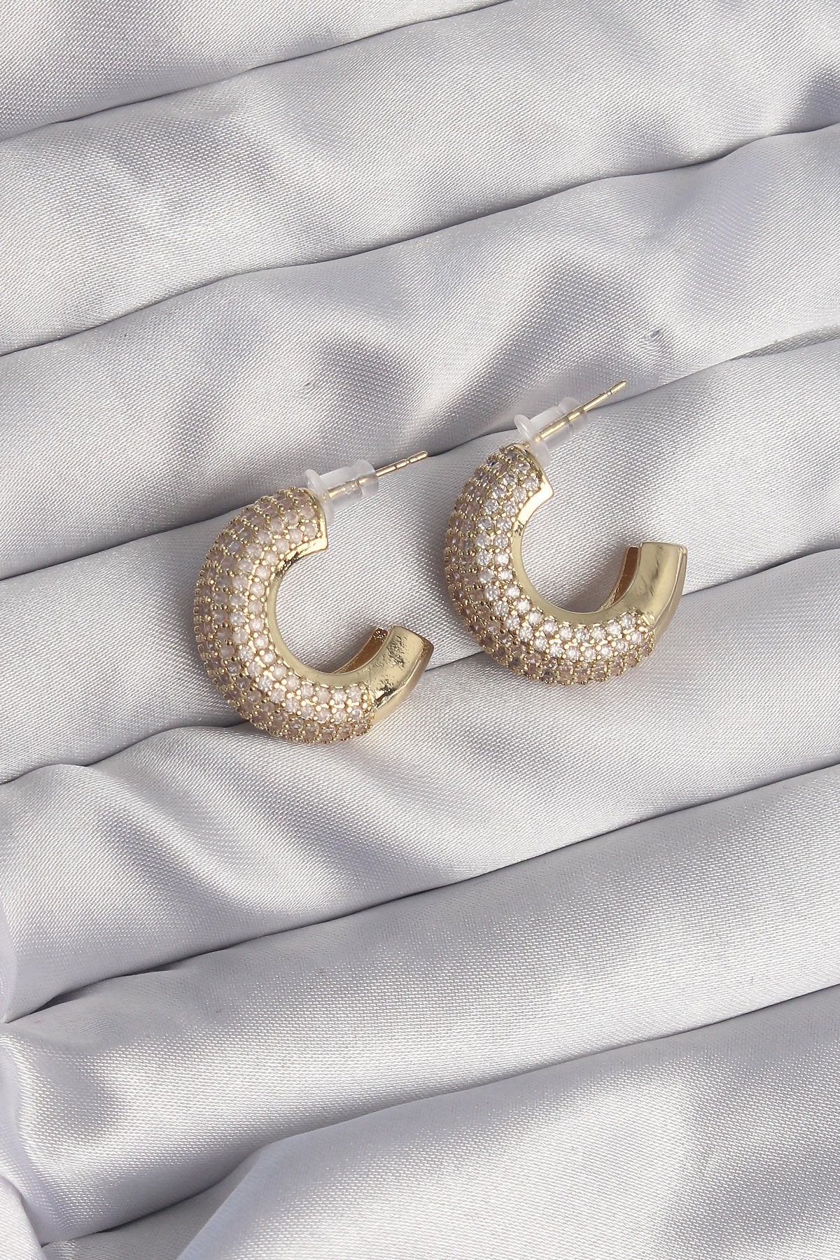 - Ürün Adı: Pirinç Gold Renk Zirkon Taşlı Yarım Halka Küpe
