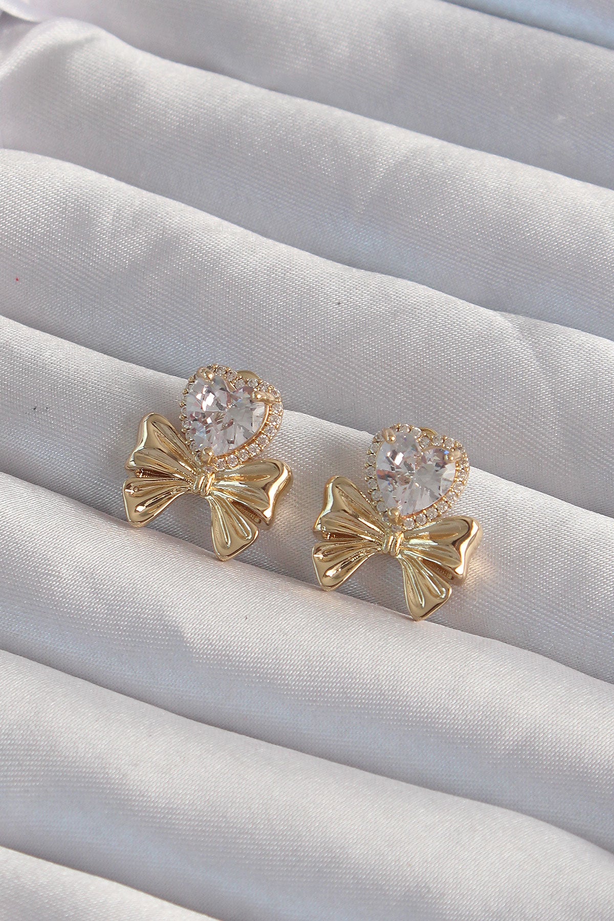 - Ürün Adı: Pirinç Gold Renk Zirkon Taşlı Kalp Model Fiyonk Küpe