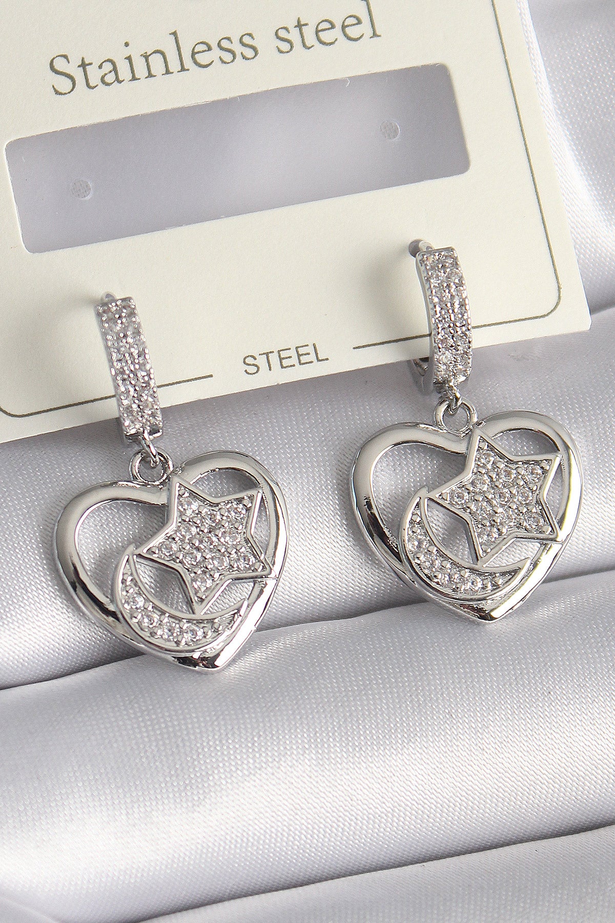 BKP9738 - Pirinç Gümüş Renk Kalp Model Zirkon Taşlı Ay Yıldız İşlemeli Kadın Küpe