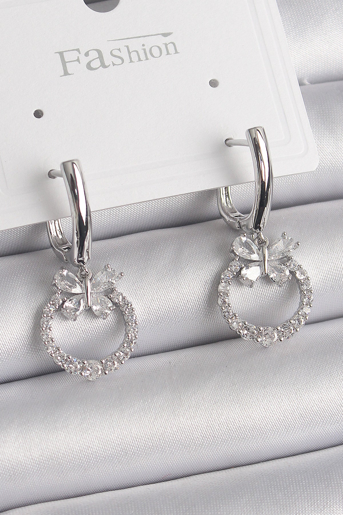 BKP9841 - Pirinç Gümüş Renk Zirkon Taşlı Kelebek Figür Sallantı Detay Kadın Küpe