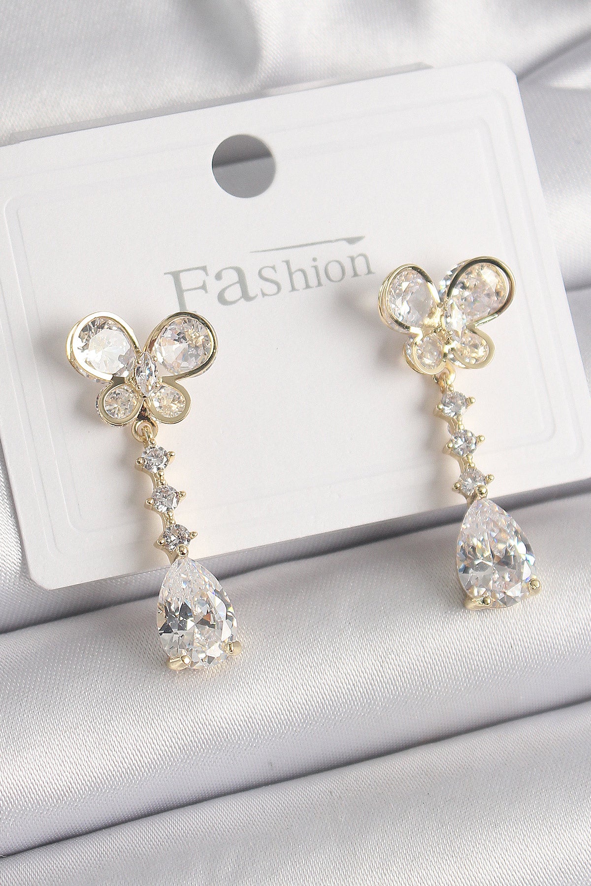 BKP9860 - Pirinç Gold Renk Zirkon Taşlı Kelebek Model Sallantı Damla Zirkon Taş Kadın Küpe