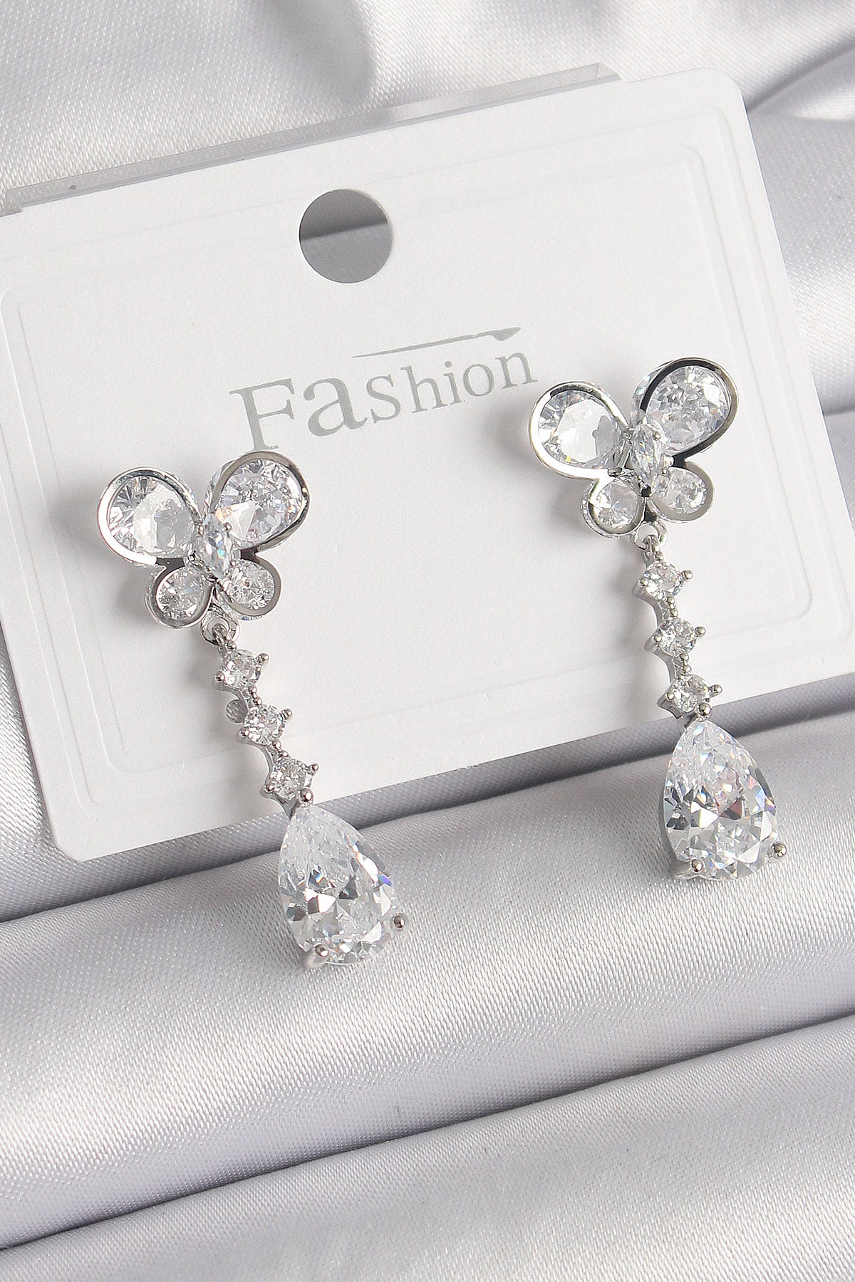 BKP9861 - Pirinç Gümüş Renk Kelebek Model Sallantı Damla Zirkon Taşlı Kadın Küpe