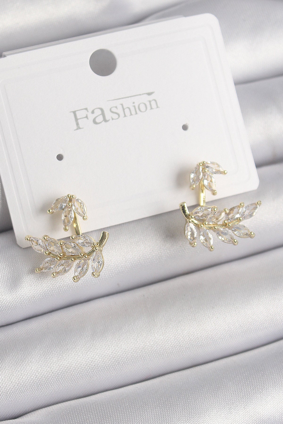 BKP9866 - Pirinç Gold Renk Zirkon Taşlı Yaprak Model Kadın Küpe