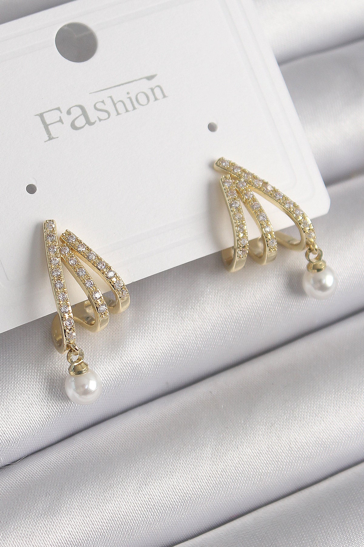 - Ürün Adı: Pirinç Gold Renk Zirkon Taşlı Pençe Model İnci Detay Kadın Küpe