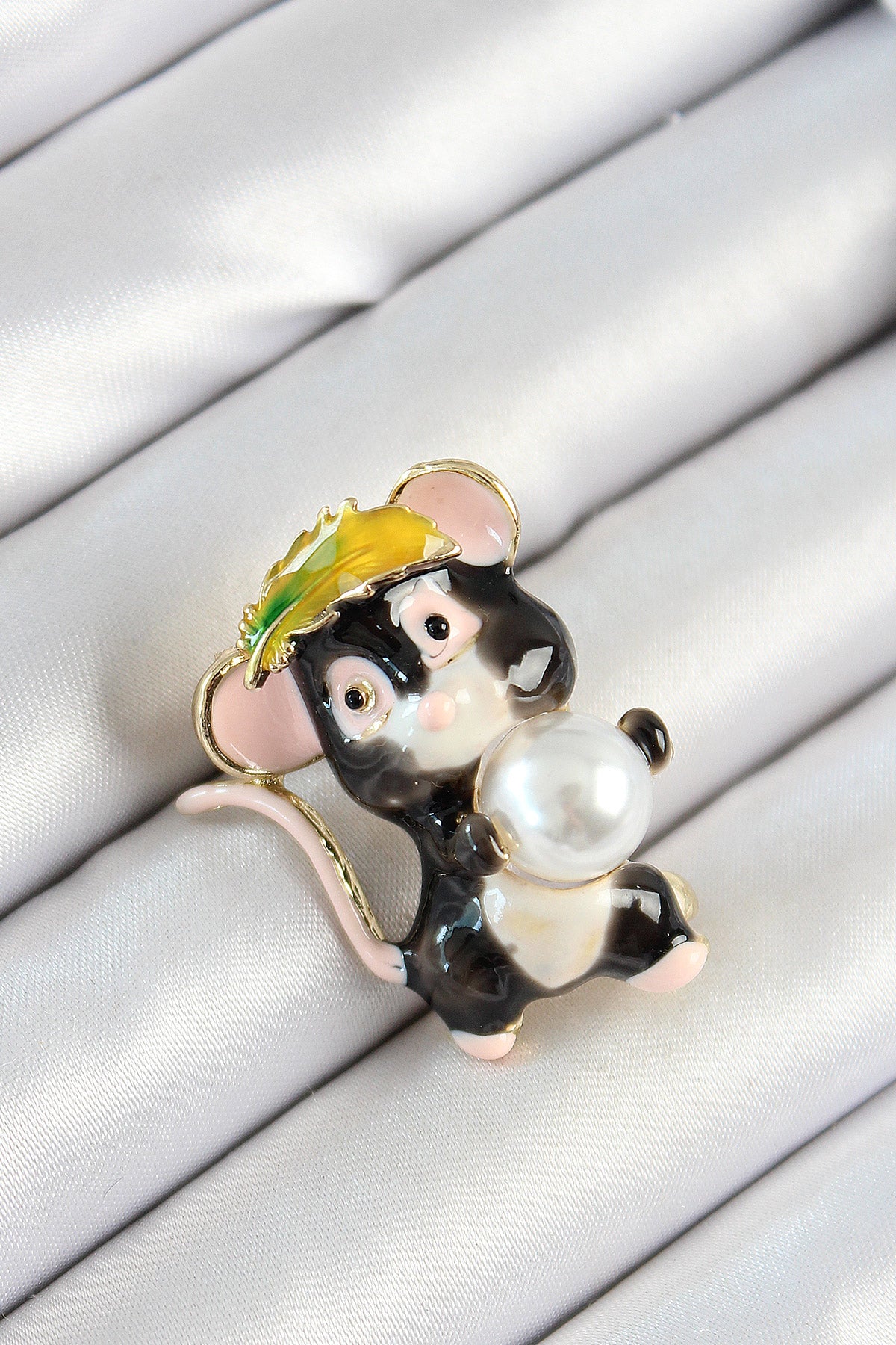BR437 - İnci Detaylı Siyah Ve Pembe 3D Sevimli Fare Figürlü Gold Renk Kadın Broş